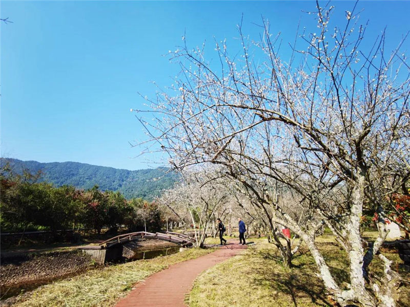 八寨溝梅園四周青山環(huán)繞,鳥語花香,當梅花盛開時,漫山遍野的梅花與青山綠水交相輝映,宛如世外桃源;當你置身其中,極目望去,朵朵梅花在艷陽冷風中傲然綻放;遠望,一樹繁花似錦如雪,近賞,朵朵白梅挺立枝頭,小巧的花瓣,精致的花蕊,潔白無瑕,成群的蜜蜂在花間縈繞。