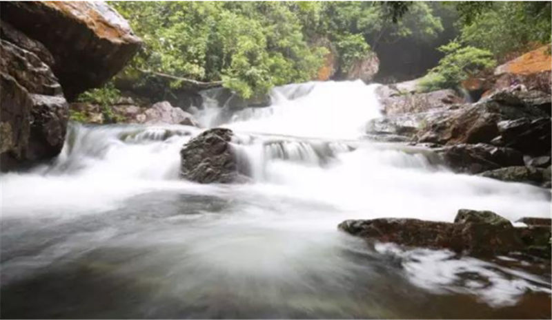 仙女池瀑布,一源兩流的巨大水流從高空落入谷底,在遠(yuǎn)處就能聽到振聾發(fā)聵的聲音,像萬馬奔騰從天上來,氣勢恢弘。