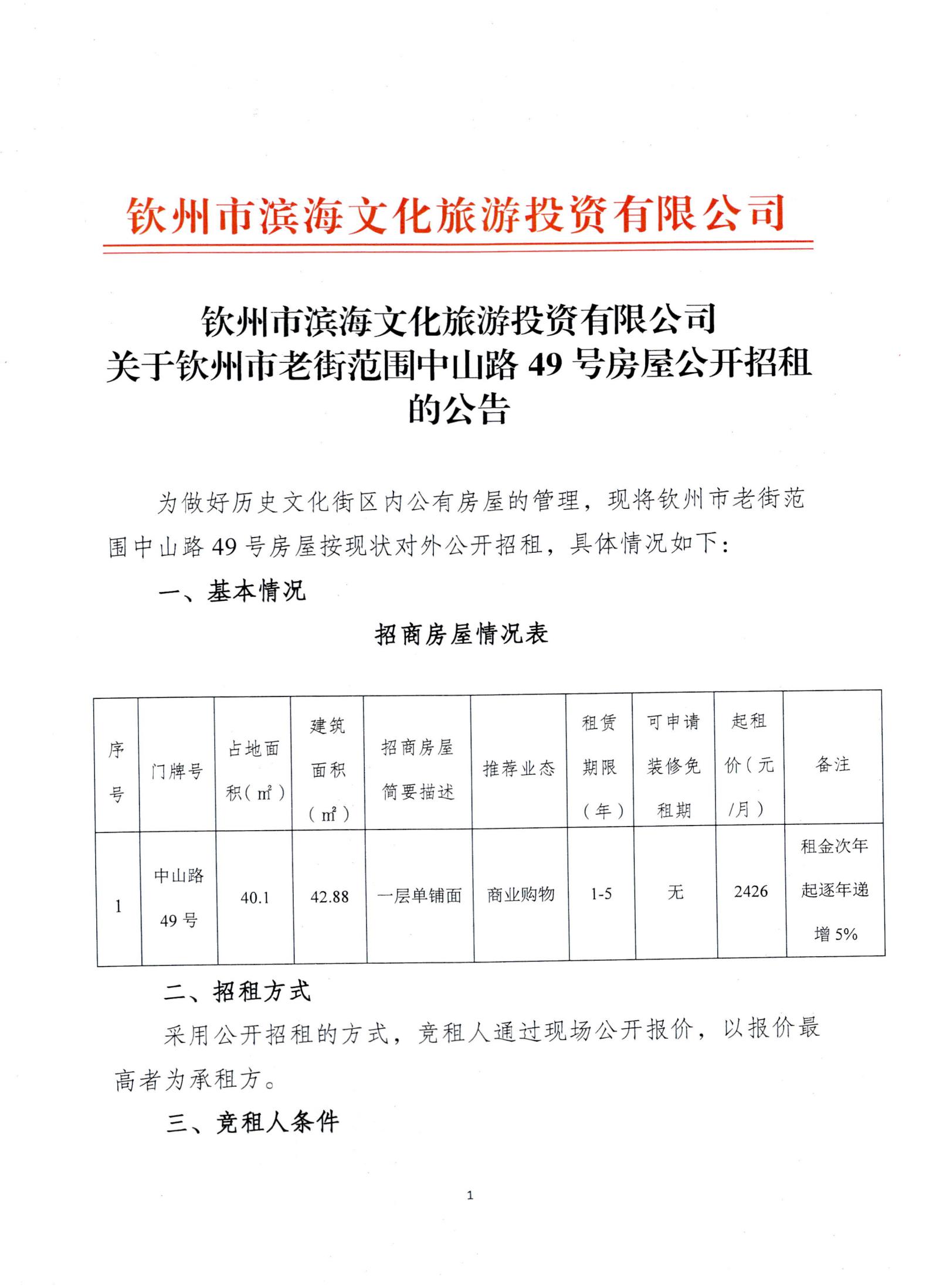 關(guān)于欽州市老街范圍中山路49號(hào)房屋公開招租的公告