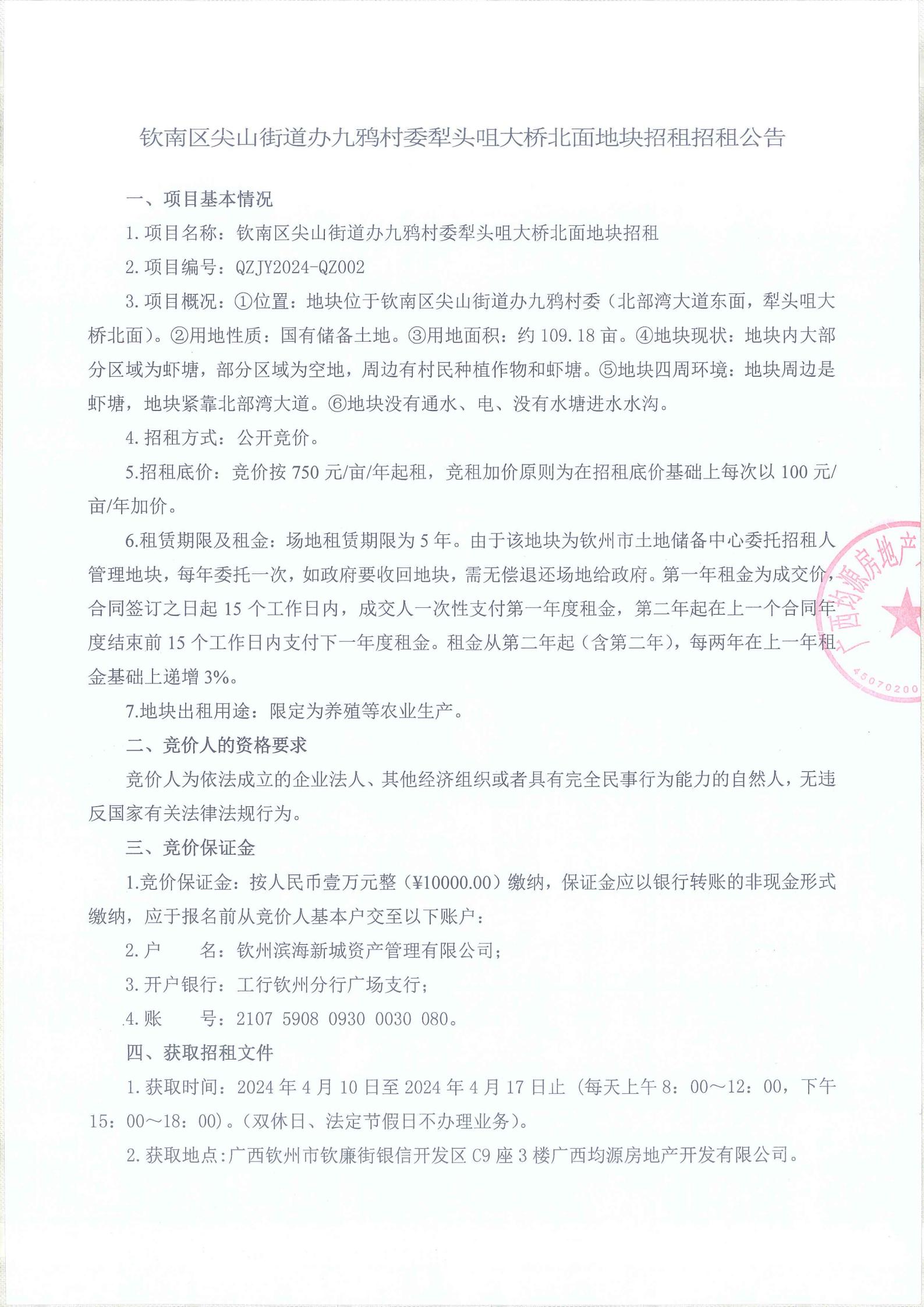 關于欽南區(qū)尖山街道辦九鴉村委梨頭咀大橋北面地塊招租成交結果公告