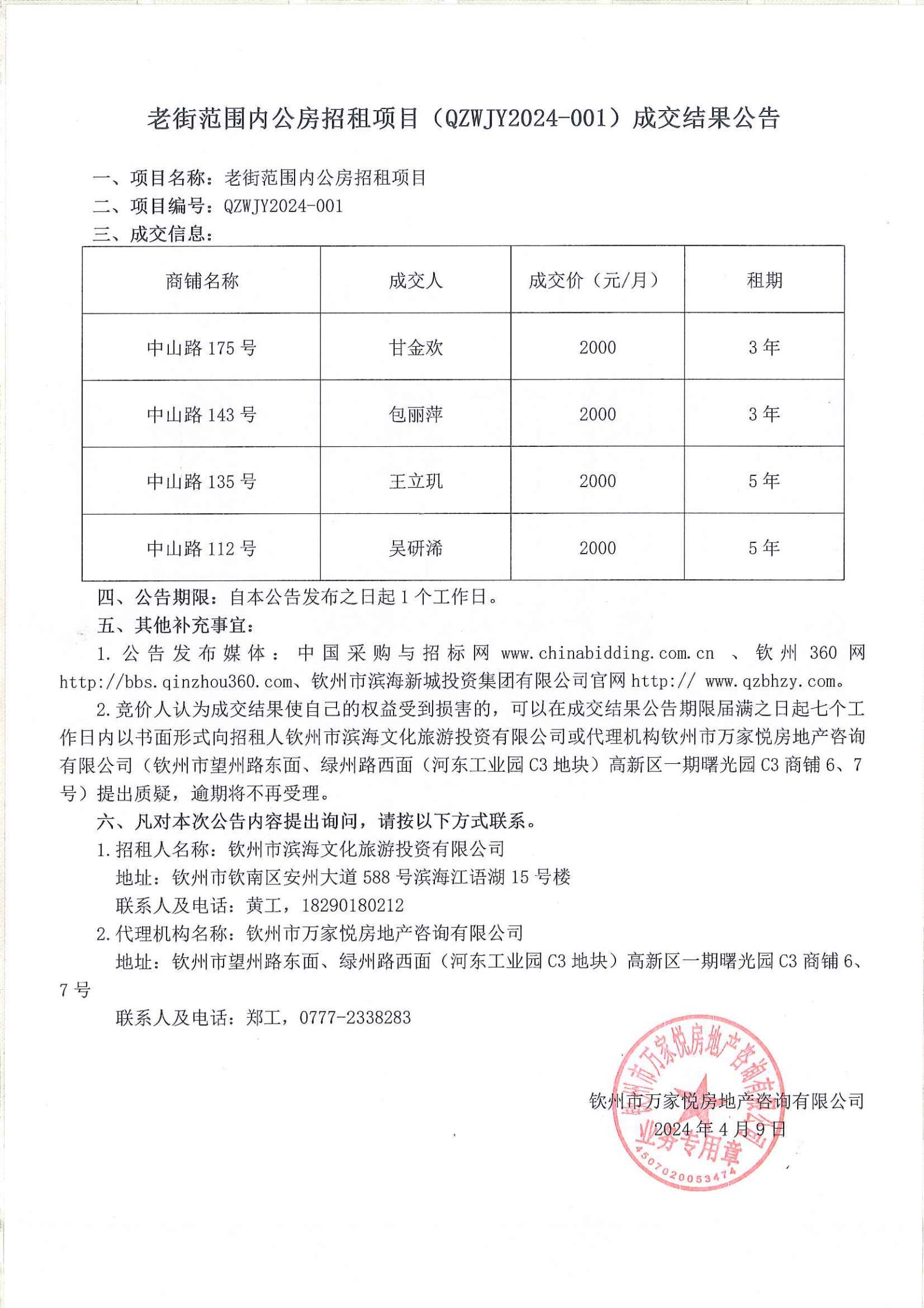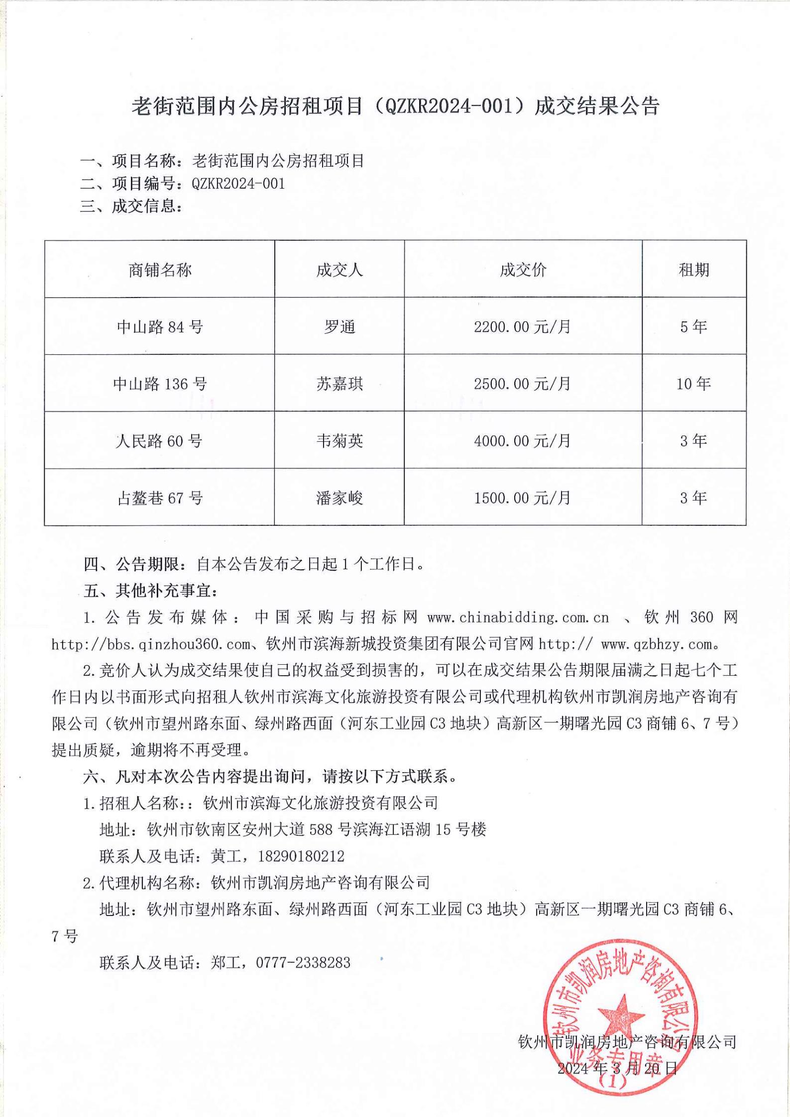 老街范圍內(nèi)公房招租項目(QZKR2024-001)成交結(jié)果公告
