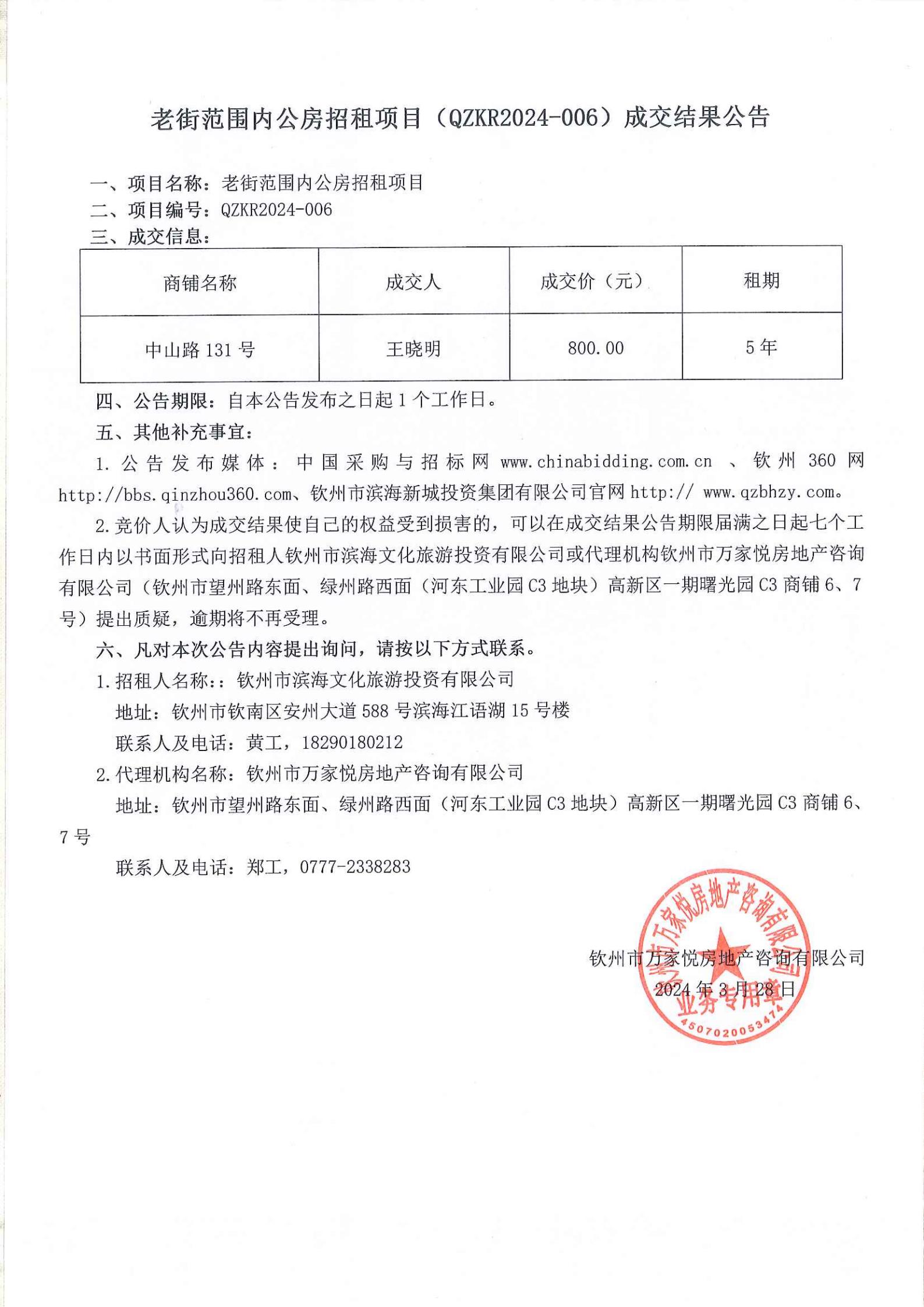 老街范圍內(nèi)公房招租項目(QZKR2024-006)成交結(jié)果公告