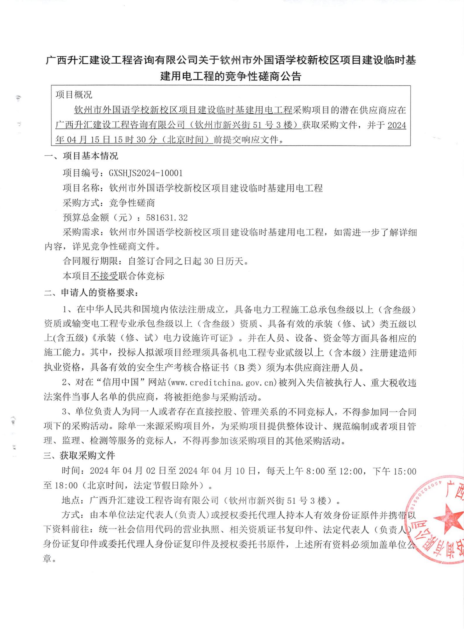 廣西升匯建設(shè)工程咨詢有限公司關(guān)于欽州市外國語學校新校區(qū)項目建設(shè)臨時基建用電工程的競爭性磋商公告