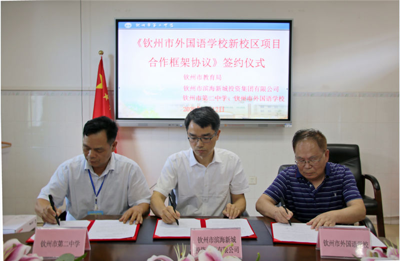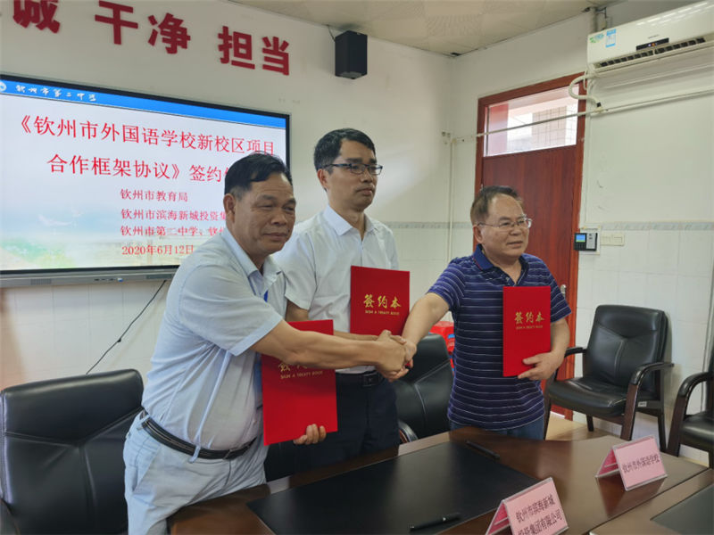 6月12日,我集團(tuán)公司與欽州市第二中學(xué)、市外國(guó)語(yǔ)學(xué)校合作項(xiàng)目——欽州市外國(guó)語(yǔ)學(xué)校新校區(qū)的合作簽約儀式在欽州市隆重舉行。簽約儀式上,集團(tuán)公司副總經(jīng)理劉一材、欽州市第二中學(xué)校長(zhǎng)劉世偉及市外國(guó)語(yǔ)學(xué)校法人代表謝立作為三方代表簽署了《欽州市外國(guó)語(yǔ)學(xué)校新校區(qū)項(xiàng)目合作框架協(xié)議》,并合影留念。
