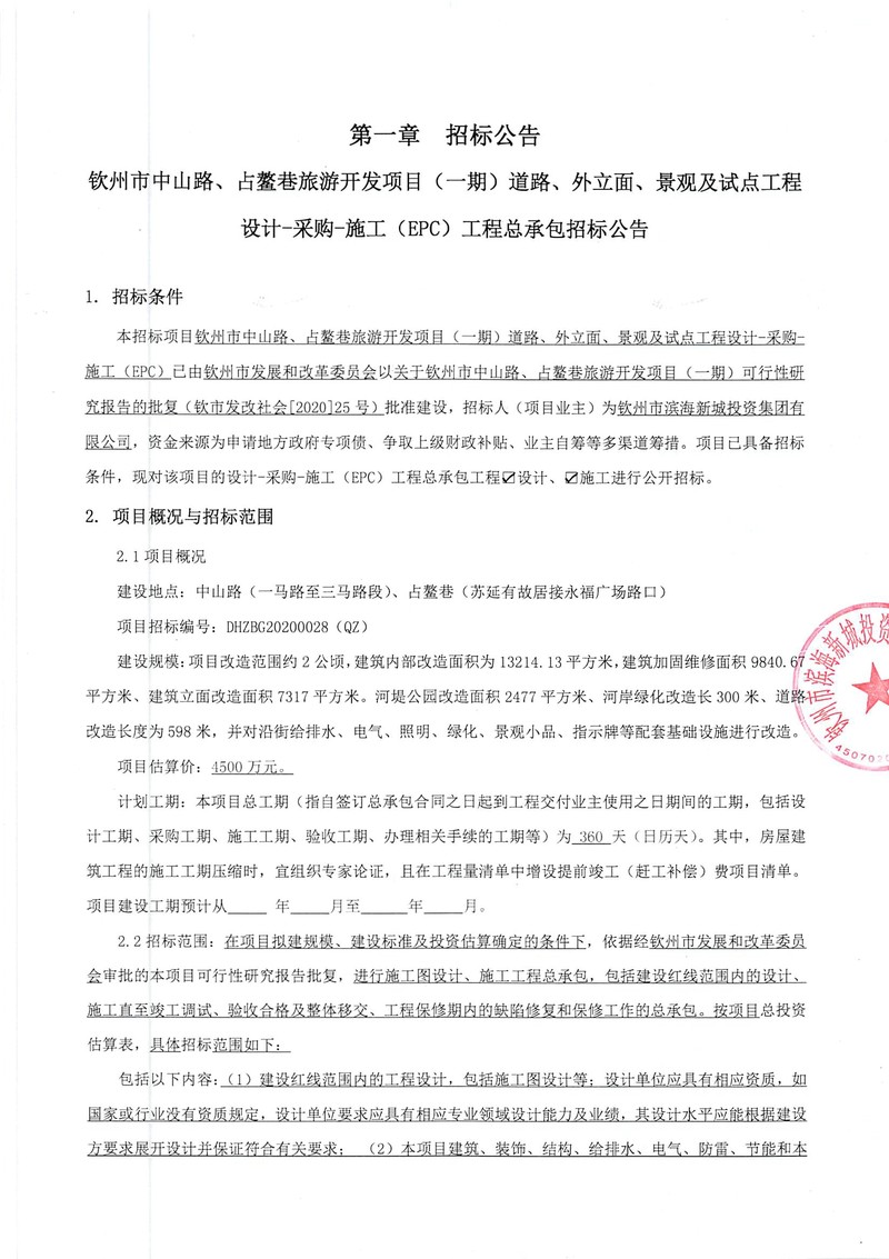 欽州市中山路、占鰲巷旅游開發(fā)項(xiàng)目(一期)道路、外立面、景觀及試點(diǎn)工程設(shè)計(jì)-采購-施工(EPC)工程總承包招標(biāo)公告
