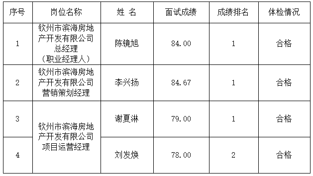 欽州市濱海新城投資集團(tuán)有限公司2024年公開招聘工作人員擬聘用人選公示(二)