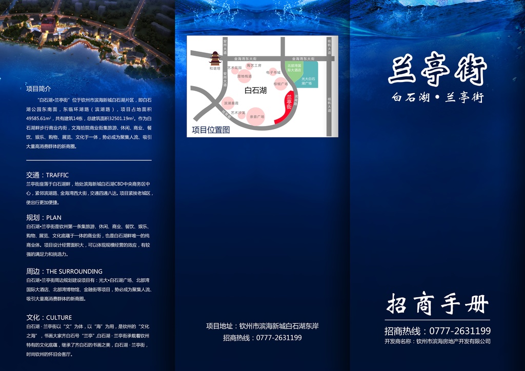 白石湖蘭亭街項(xiàng)目坐落于欽州濱海新城白石湖畔,毗鄰光大商圈,由風(fēng)格獨(dú)特的獨(dú)立式建筑群組成。項(xiàng)目占地面積49585.61㎡,總建筑面積32501.19㎡,地下停車場(chǎng)300多個(gè)停車位。作為白石湖畔步行商業(yè)內(nèi)街,蘭亭街集旅游、休閑、商業(yè)、餐飲、娛樂、購(gòu)物、展覽、文化于一體,勢(shì)必成為聚集人流、吸引大量高消費(fèi)群體的商圈。