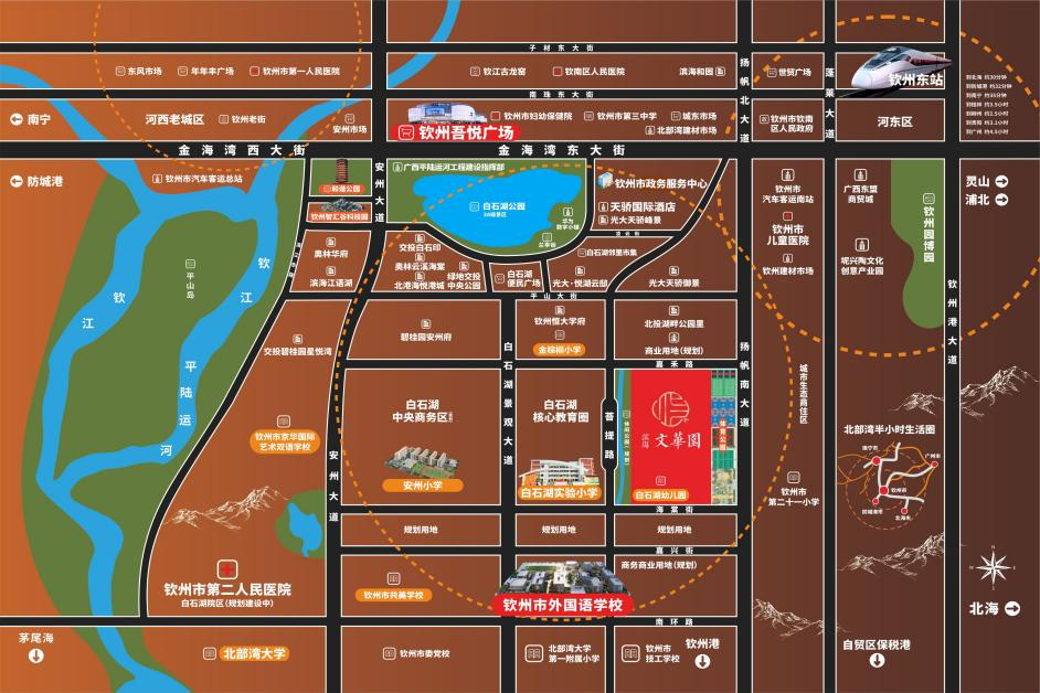 濱海·文華園項目地處白石湖商務區(qū)核心地段,位于白石湖公園、吾悅廣場、市政服務中心半小時生活圈,交通路網(wǎng)四通八達,各類城市配套完善,距離欽州東站、園博園較近。