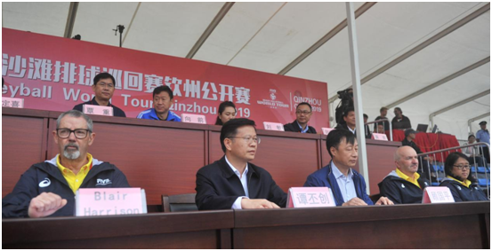 10月31日,2019年世界沙灘排球賽—欽州公開(kāi)賽開(kāi)幕式在比賽現(xiàn)場(chǎng)主賽場(chǎng)舉行,國(guó)際排聯(lián)技術(shù)代表布萊爾•哈里森、國(guó)家體育總局排球運(yùn)動(dòng)管理中心黨委書(shū)記顧國(guó)平講話,譚丕創(chuàng)市長(zhǎng)致辭并宣布2019年世界沙灘排球巡回賽開(kāi)幕。