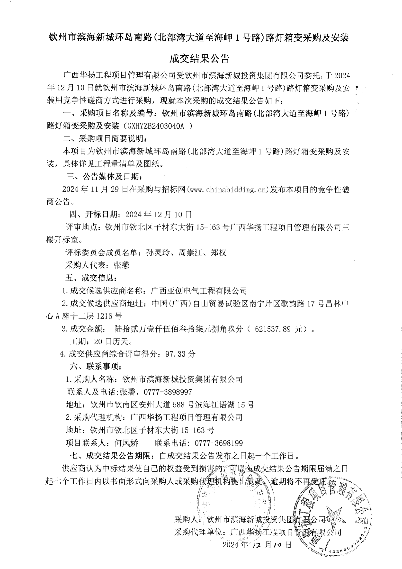 欽州市濱海新城環(huán)島南路(北部灣大道至海岬1號路)路燈箱變采購及安裝成交結(jié)果公告