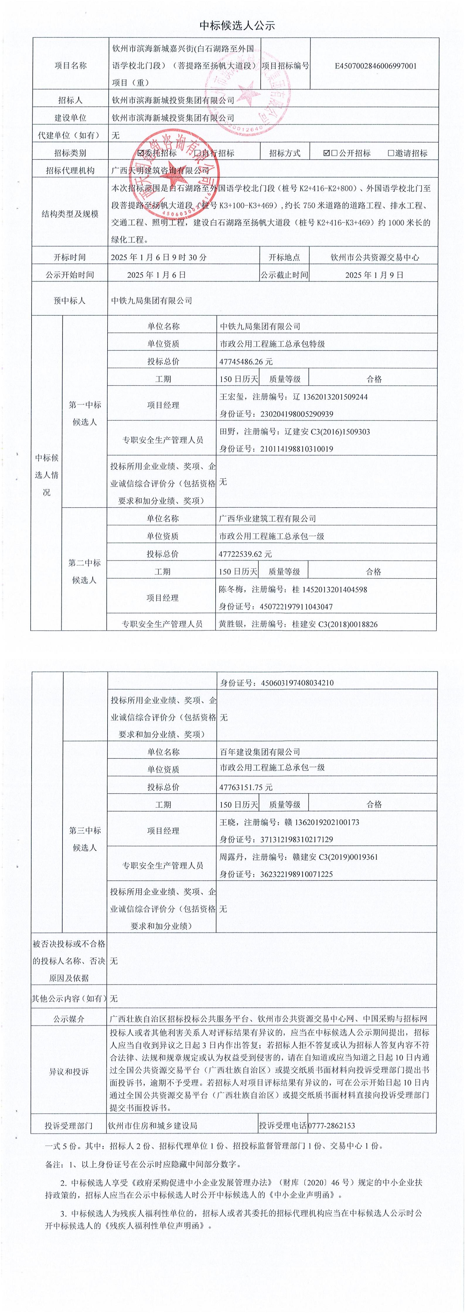 欽州市濱海新城嘉興街(白石湖路至外國語學(xué)校北門段)(菩提路至揚帆大道段)項目(重)中標候選人公示