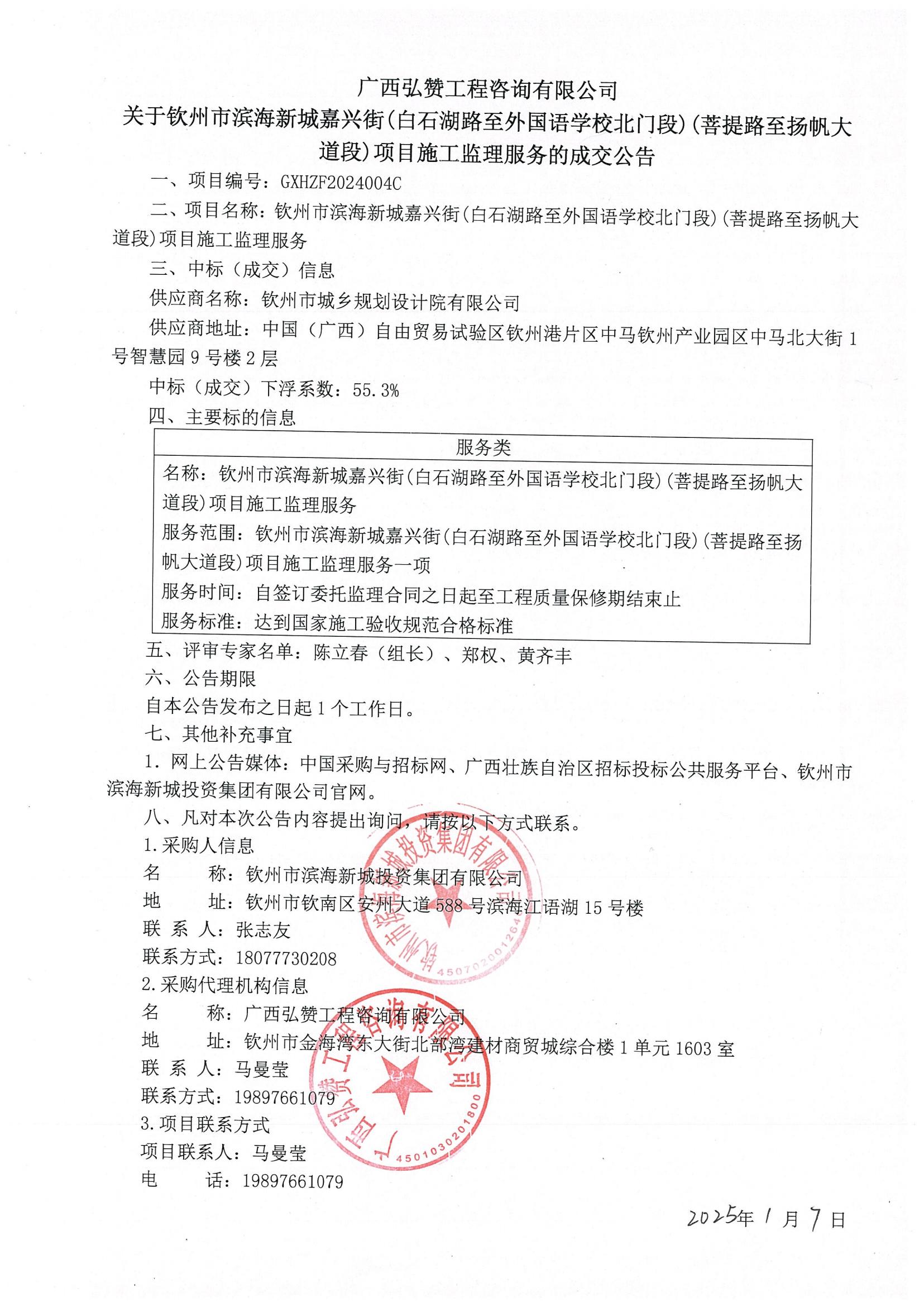 廣西弘贊工程咨詢有限公司關(guān)于欽州市濱海新城嘉興街(白石湖路至外國語學(xué)校北門段)(菩提路至揚帆大道段)項目施工監(jiān)理服務(wù)的成交公告