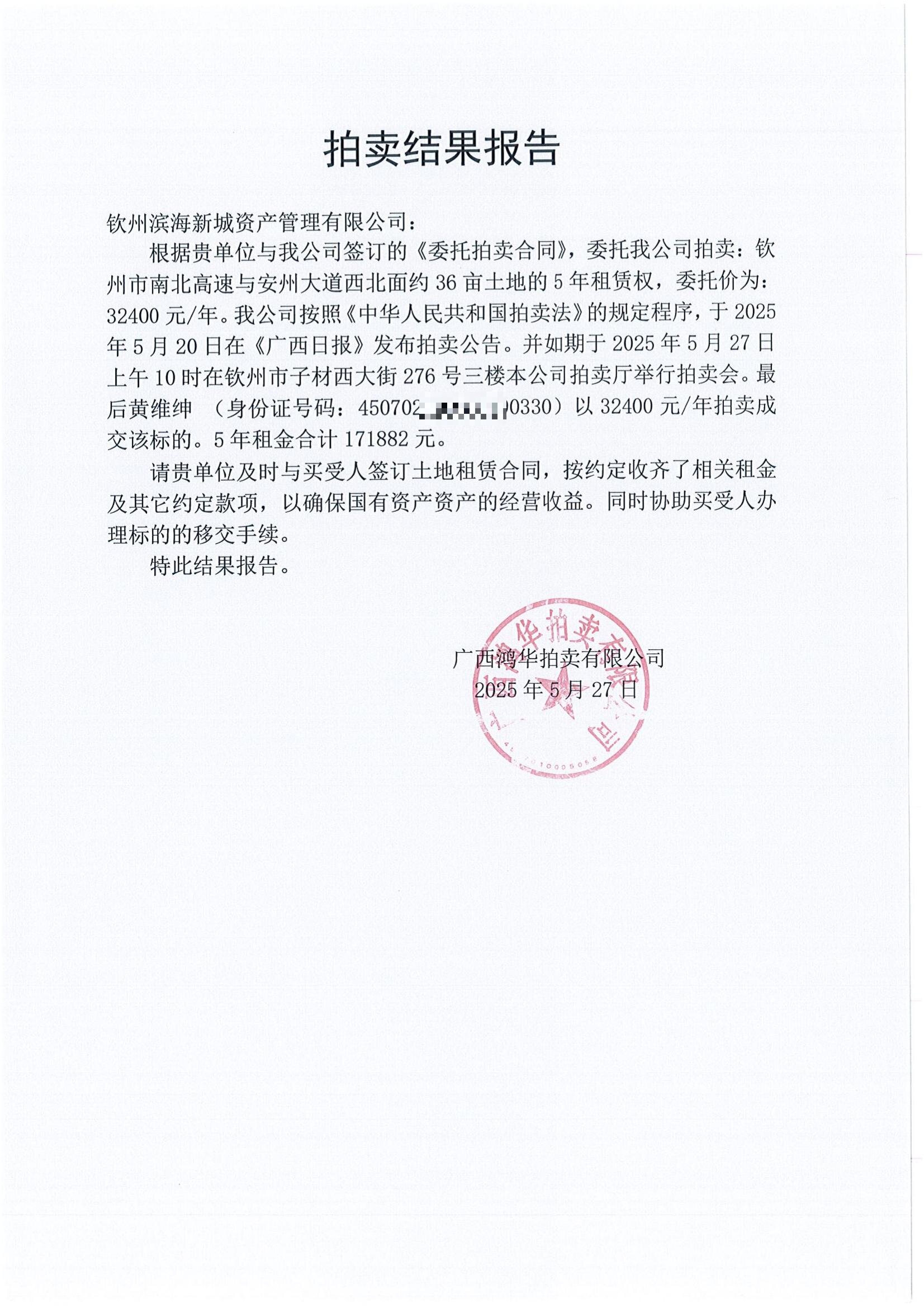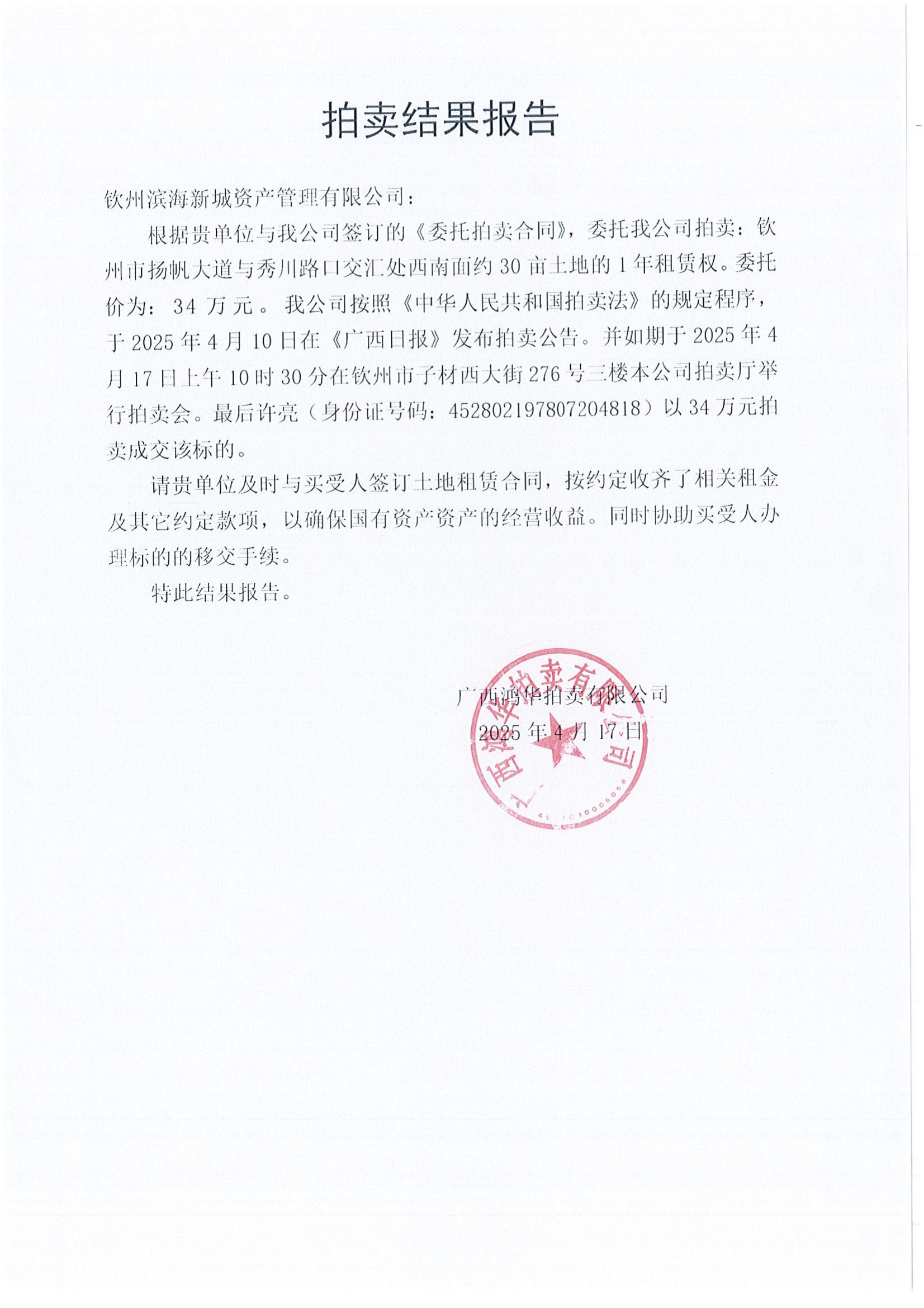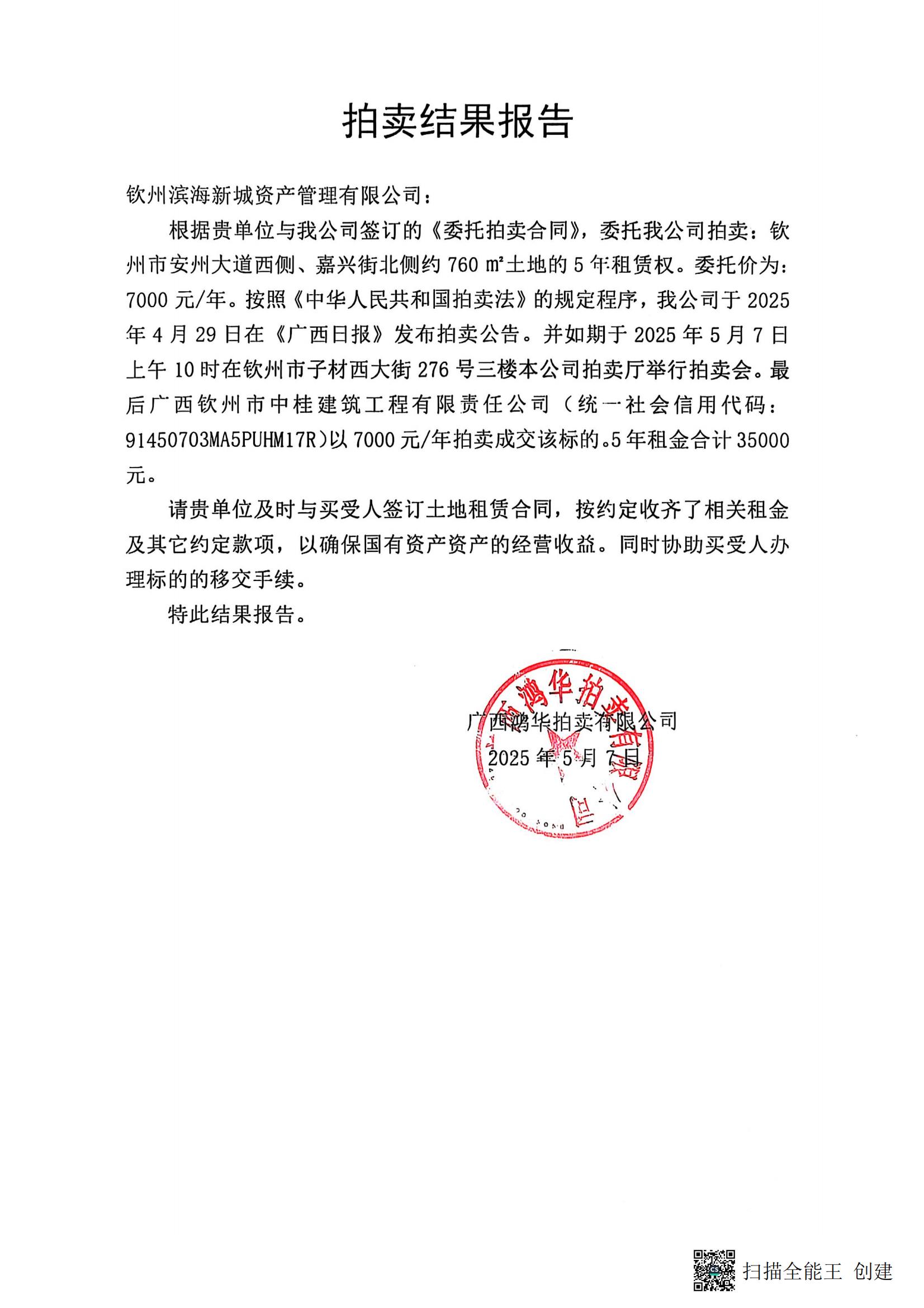 欽州市欽南區(qū)祥安路西側(cè)土地公開招租項目成交確認書