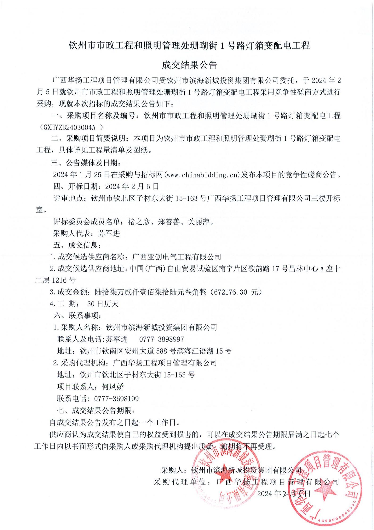 欽州市市政工程和照明管理處珊瑚街1號路燈箱變配電工程成交結(jié)果公告