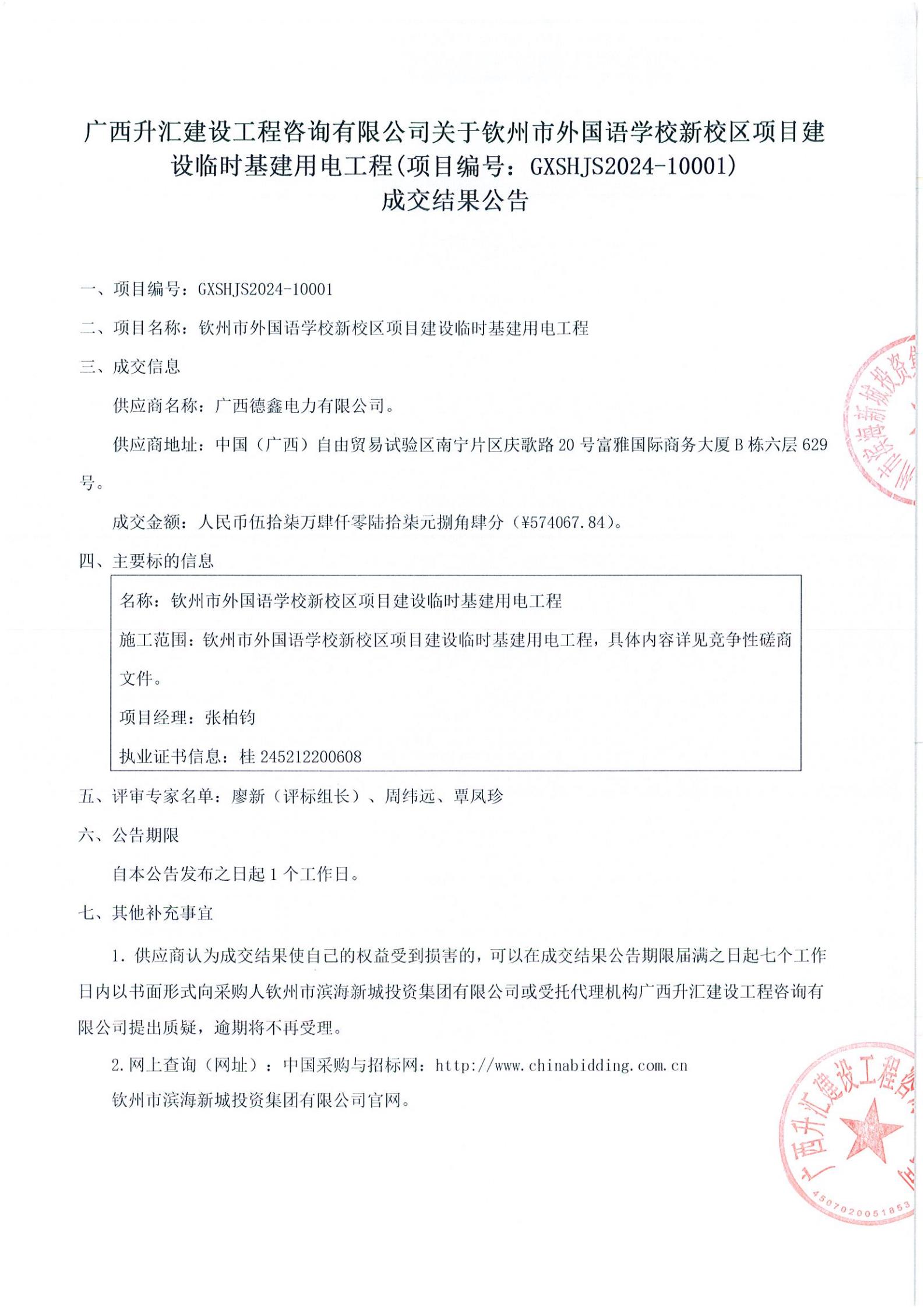 欽州市外國語學(xué)校新校區(qū)項目建設(shè)臨時基建用電工程成交結(jié)果公告