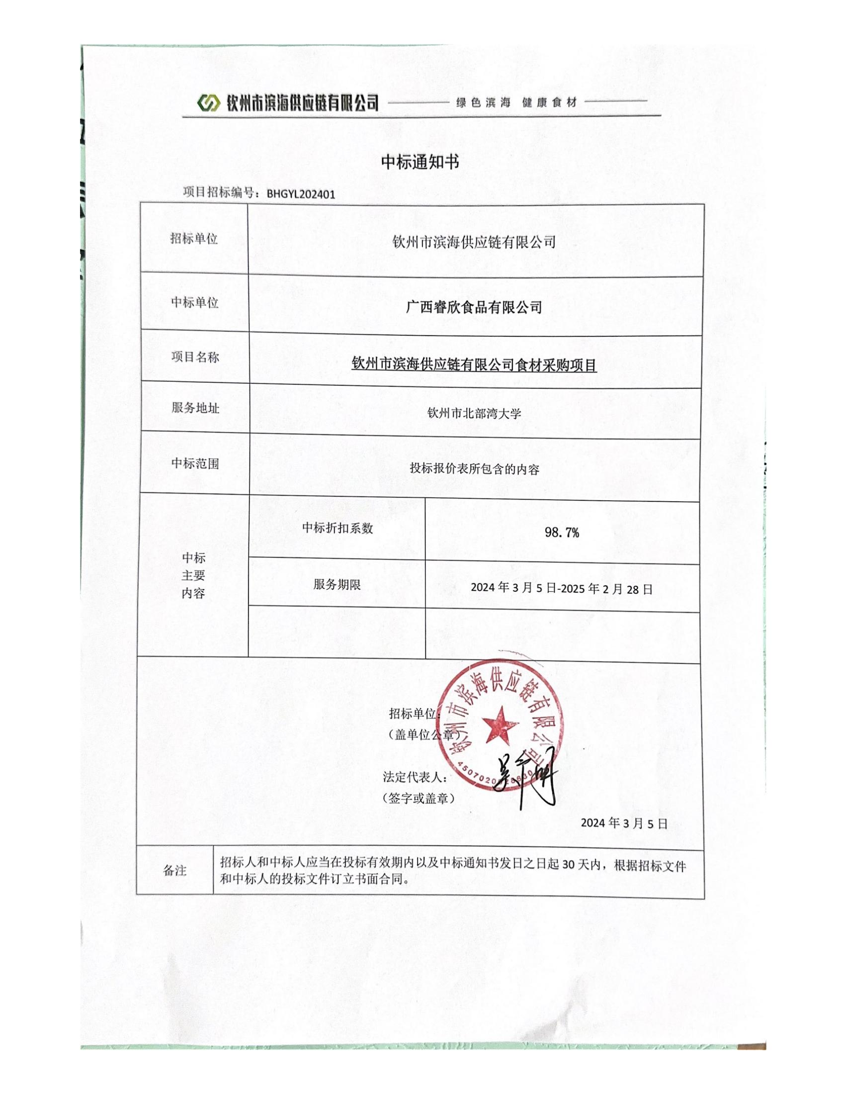 中標(biāo)通知書(欽州市濱海供應(yīng)鏈有限公司食材采購項目)