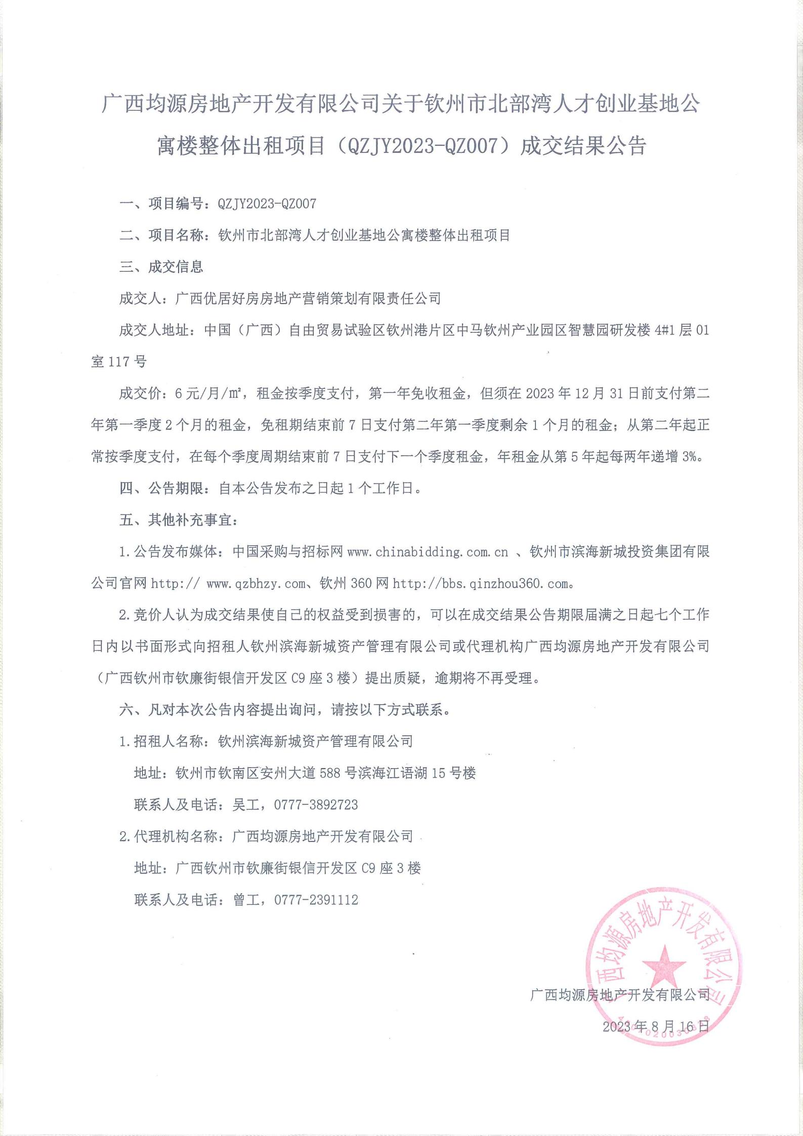 關(guān)于欽州市北部灣人才創(chuàng)業(yè)基地公寓樓整體出租項(xiàng)目成交結(jié)果公告