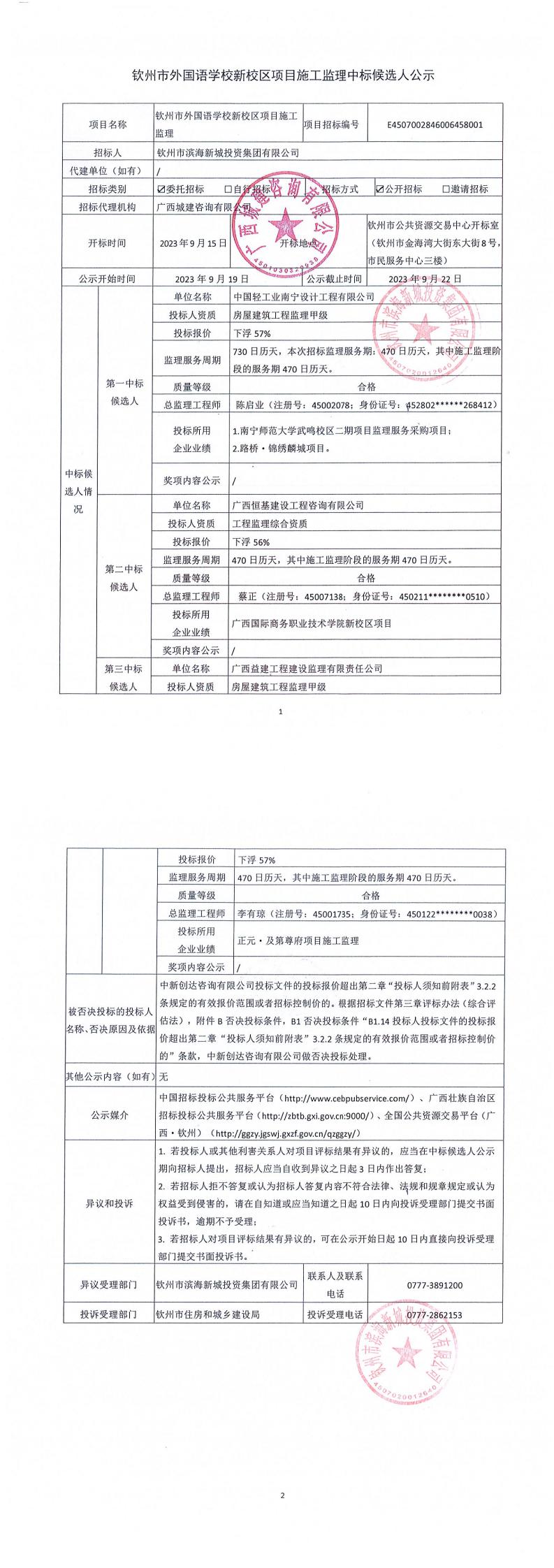 欽州市外國語學(xué)校新校區(qū)項(xiàng)目施工監(jiān)理中標(biāo)候選人公示