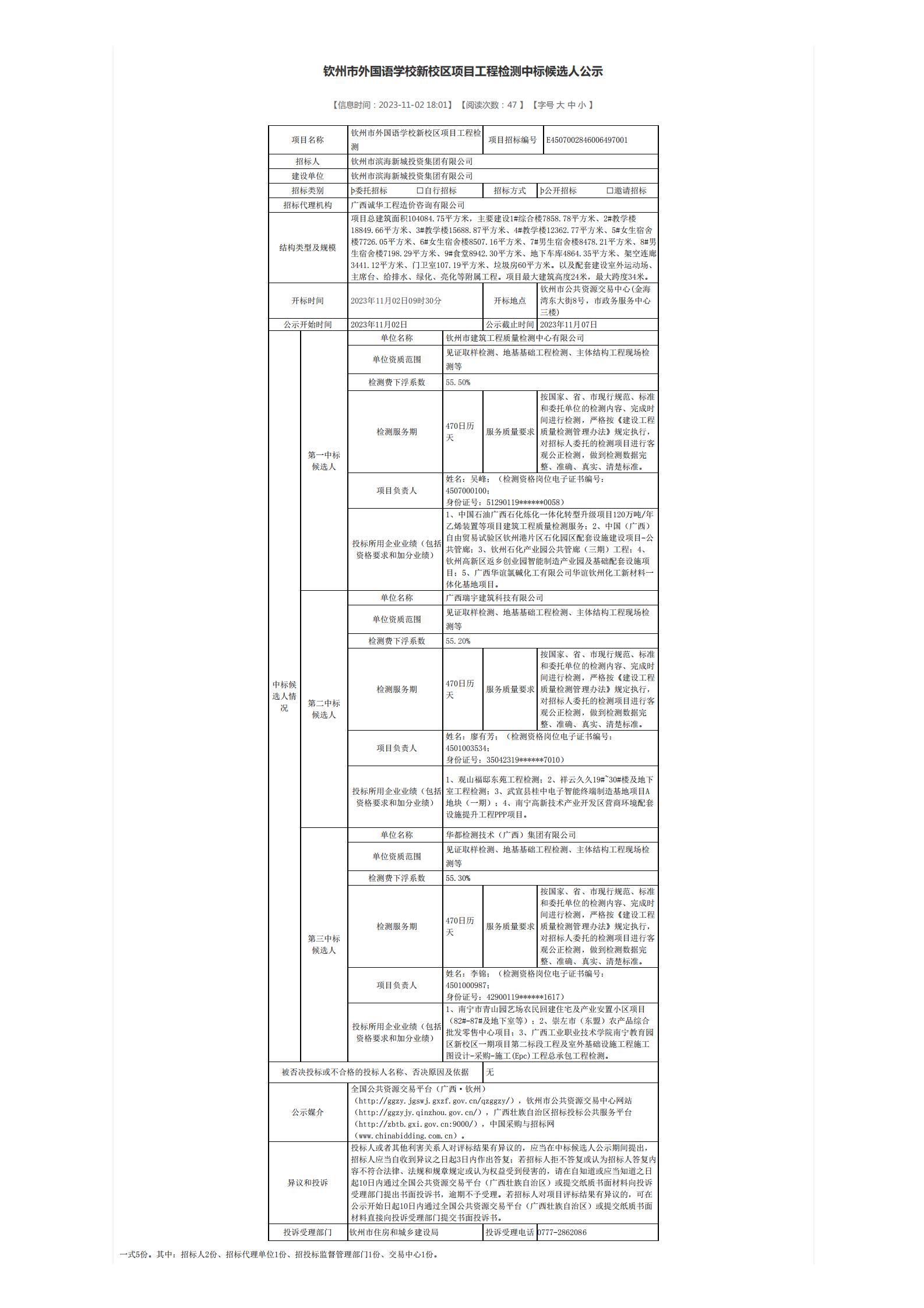 欽州市外國語學(xué)校新校區(qū)項(xiàng)目工程檢測中標(biāo)候選人公示