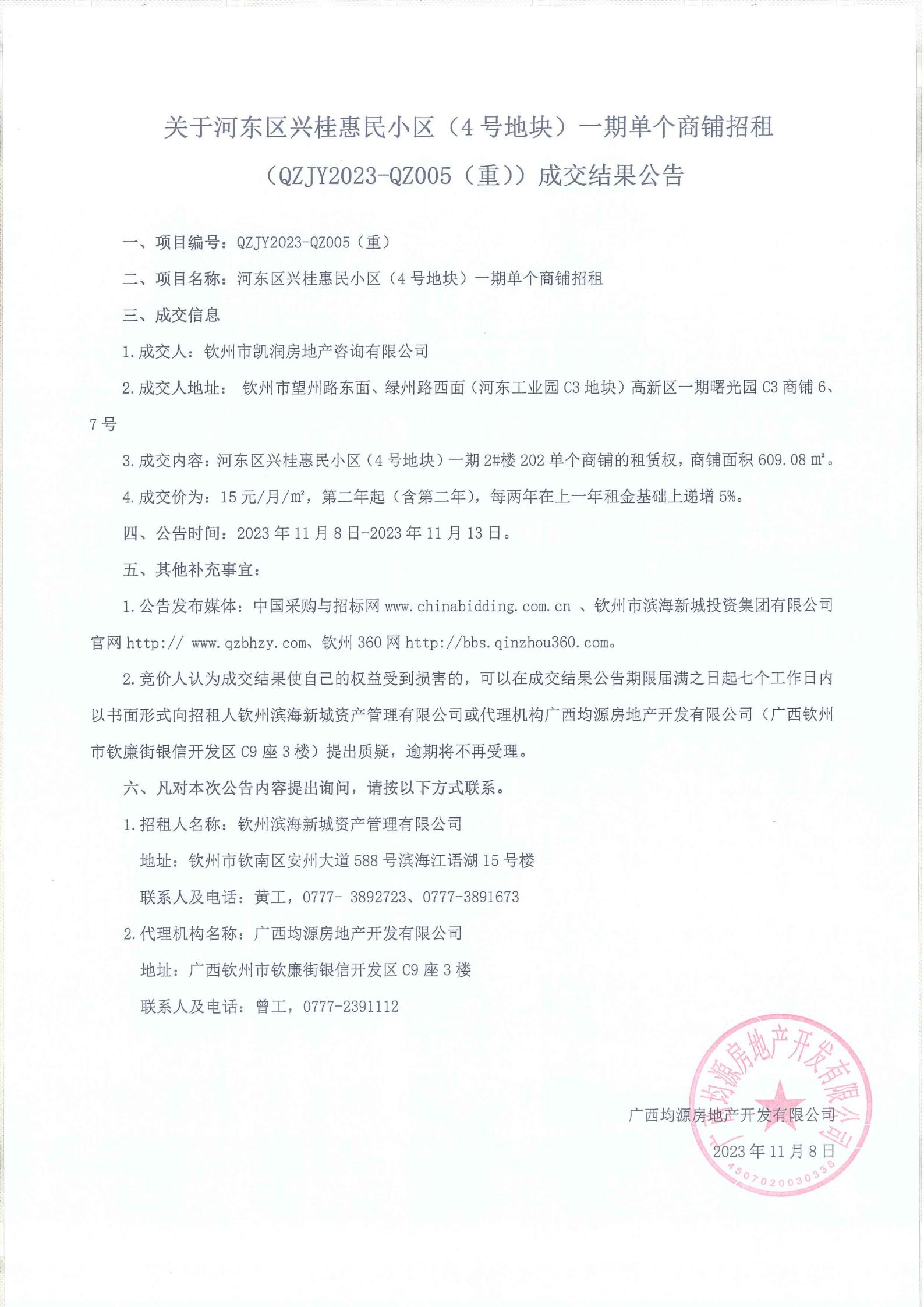 河?xùn)|區(qū)興桂惠民小區(qū)(4號地塊)一期單個商鋪招租(qzjy2023-qz005(重))成交結(jié)果公告