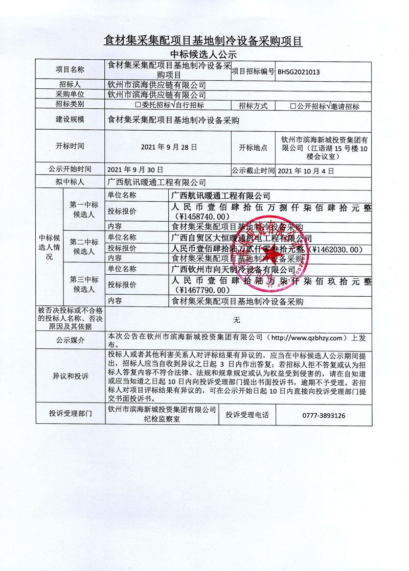 食材集采集配項目基地制冷設(shè)備采購項目中標(biāo)候選人公示