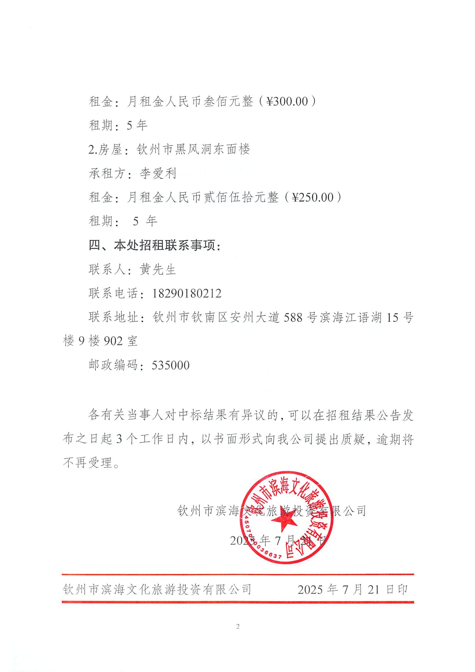 欽州市濱海文化旅游投資有限公司關(guān)于欽州市老街范圍2處房屋公開(kāi)招租結(jié)果公示