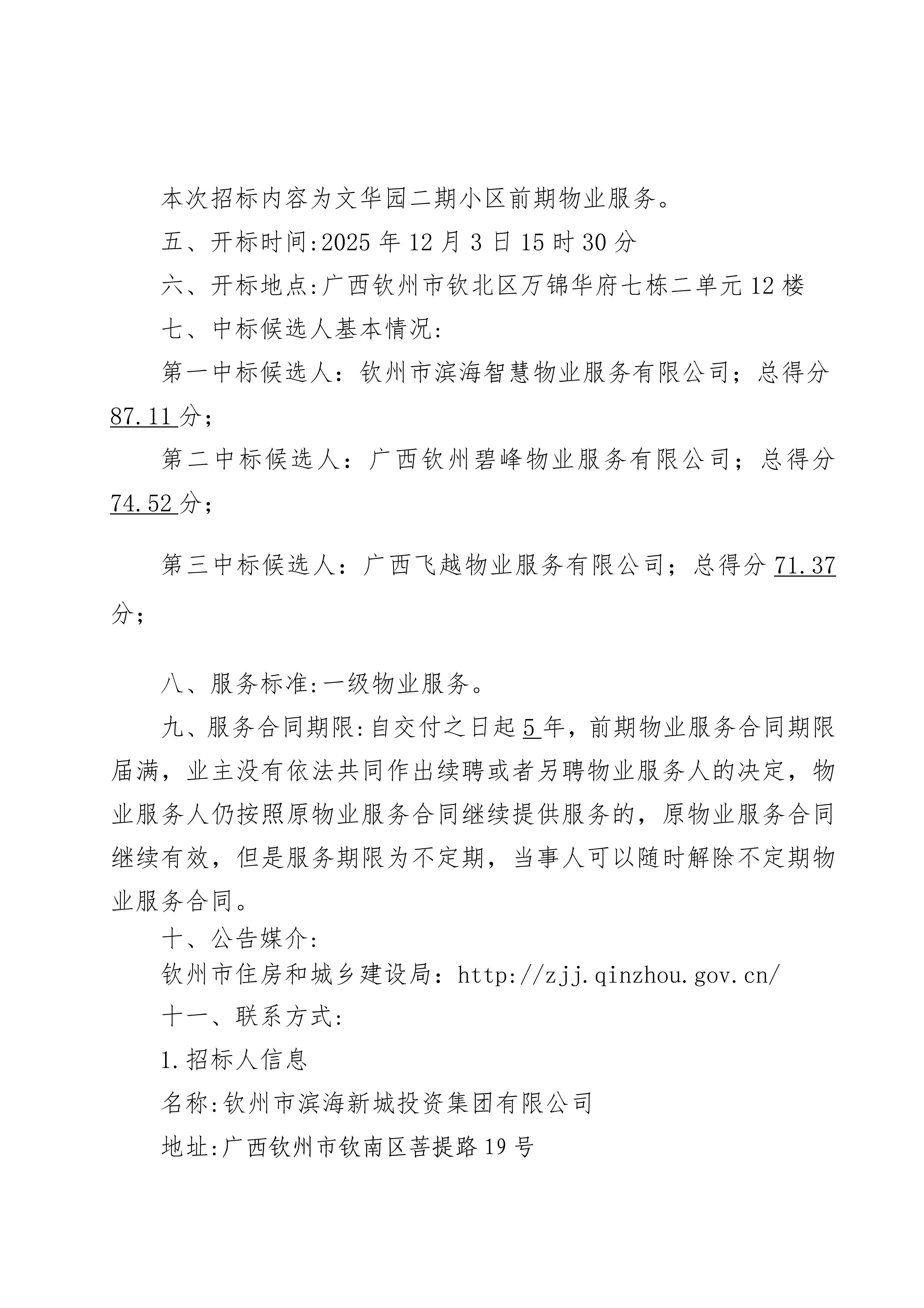 文華園二期小區(qū)前期物業(yè)管理招投標(biāo)中標(biāo)候選人公示信息
