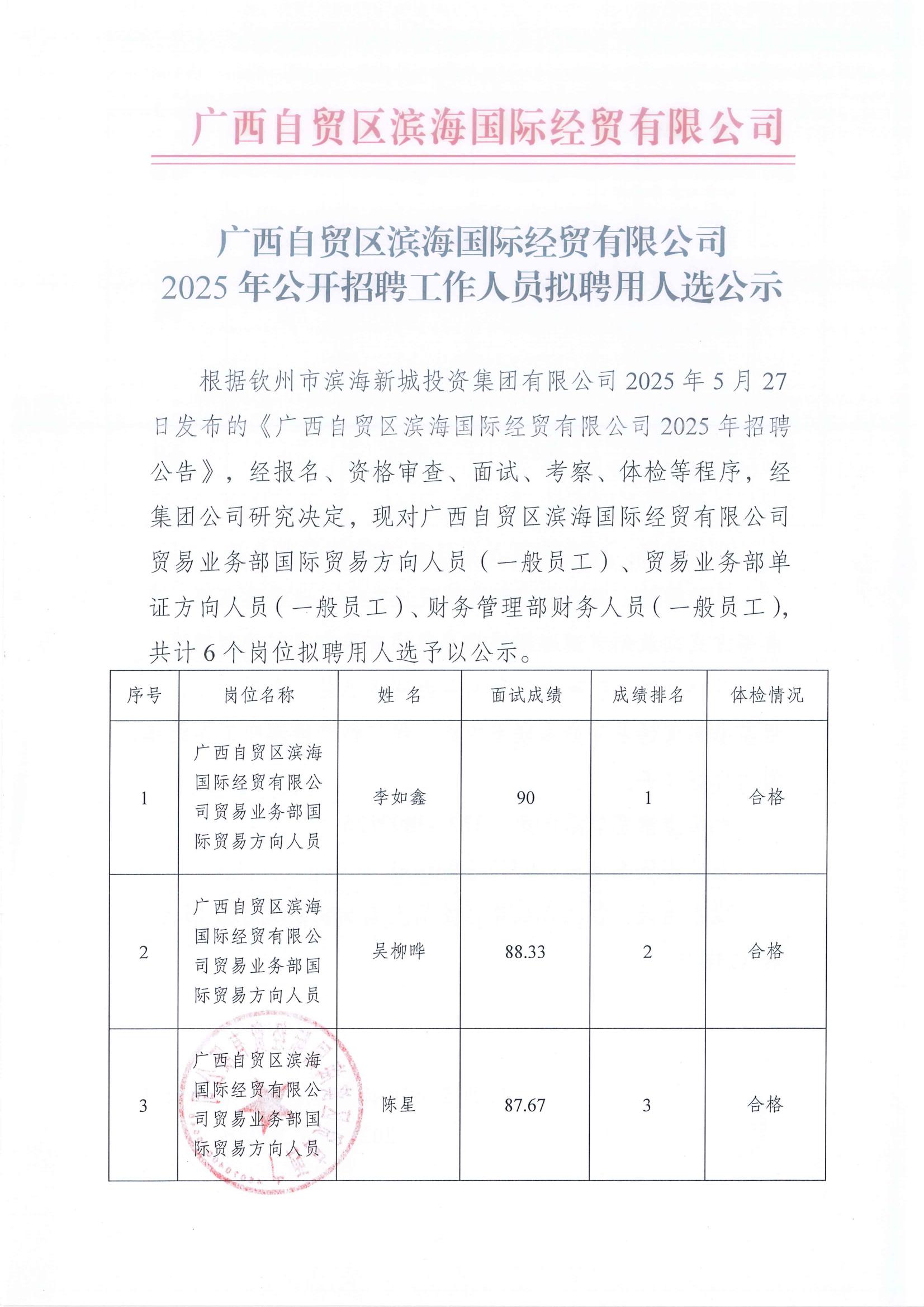 廣西自貿(mào)區(qū)濱海國(guó)際經(jīng)貿(mào)有限公司2025年公開(kāi)招聘工作人員擬聘用人選公示