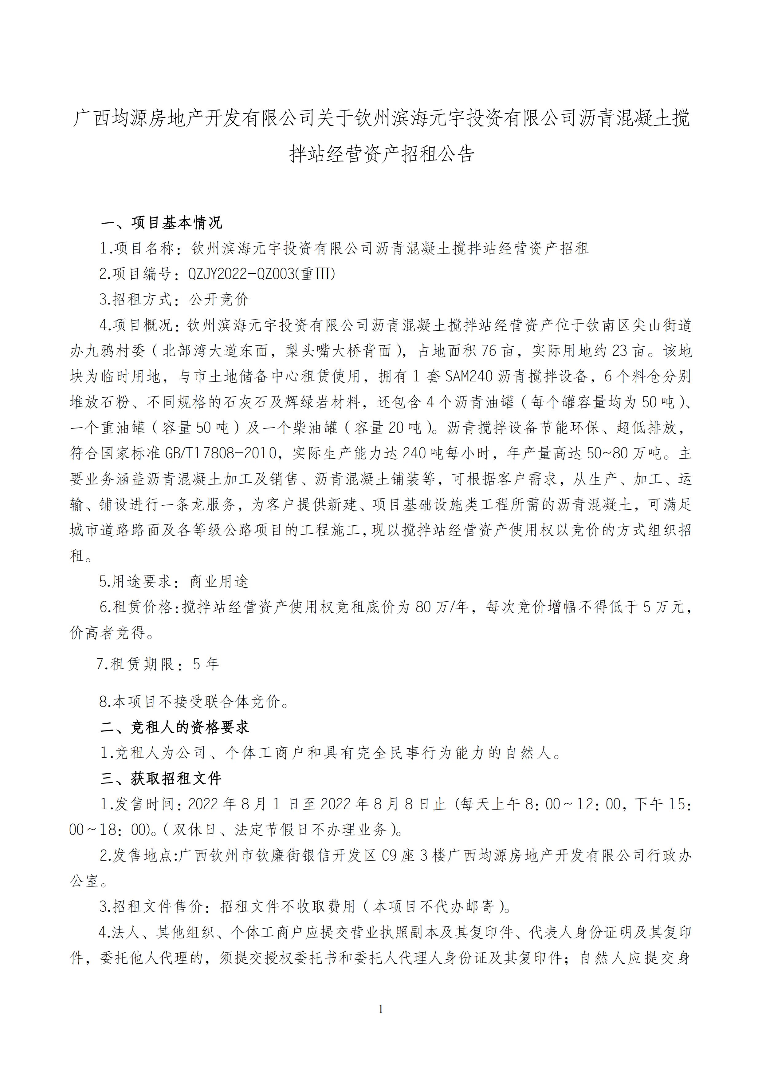廣西均源房地產(chǎn)開發(fā)有限公司關(guān)于欽州濱海元宇投資有限公司瀝青混凝土攪拌站經(jīng)營(yíng)資產(chǎn)招租公告
