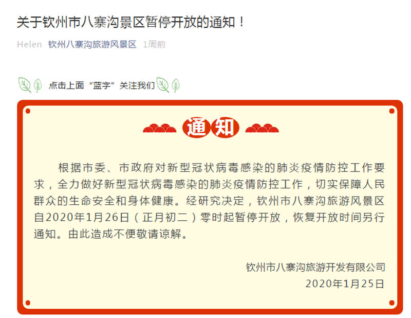 為進一步加強八寨溝景區(qū)新型冠狀病毒感染的肺炎疫情防控工作,有效防止疫情經(jīng)旅游途徑傳播,切實保障游客及公司員工身體健康和生命安全。根據(jù)欽州市委專題擴大會議對新型冠狀病毒感染肺炎疫情防控工作的部署,欽州市文化廣電體育和旅游局《關(guān)于取消欽州市 2020 年春節(jié)期間文化體育旅游活動和暫停相關(guān)文化體育旅游業(yè)務(wù)的通知》,以及欽州市文化廣電體育和旅游局《關(guān)于全市A級景區(qū)、鄉(xiāng)村旅游區(qū)、農(nóng)家樂暫停對外開放的通知》,...