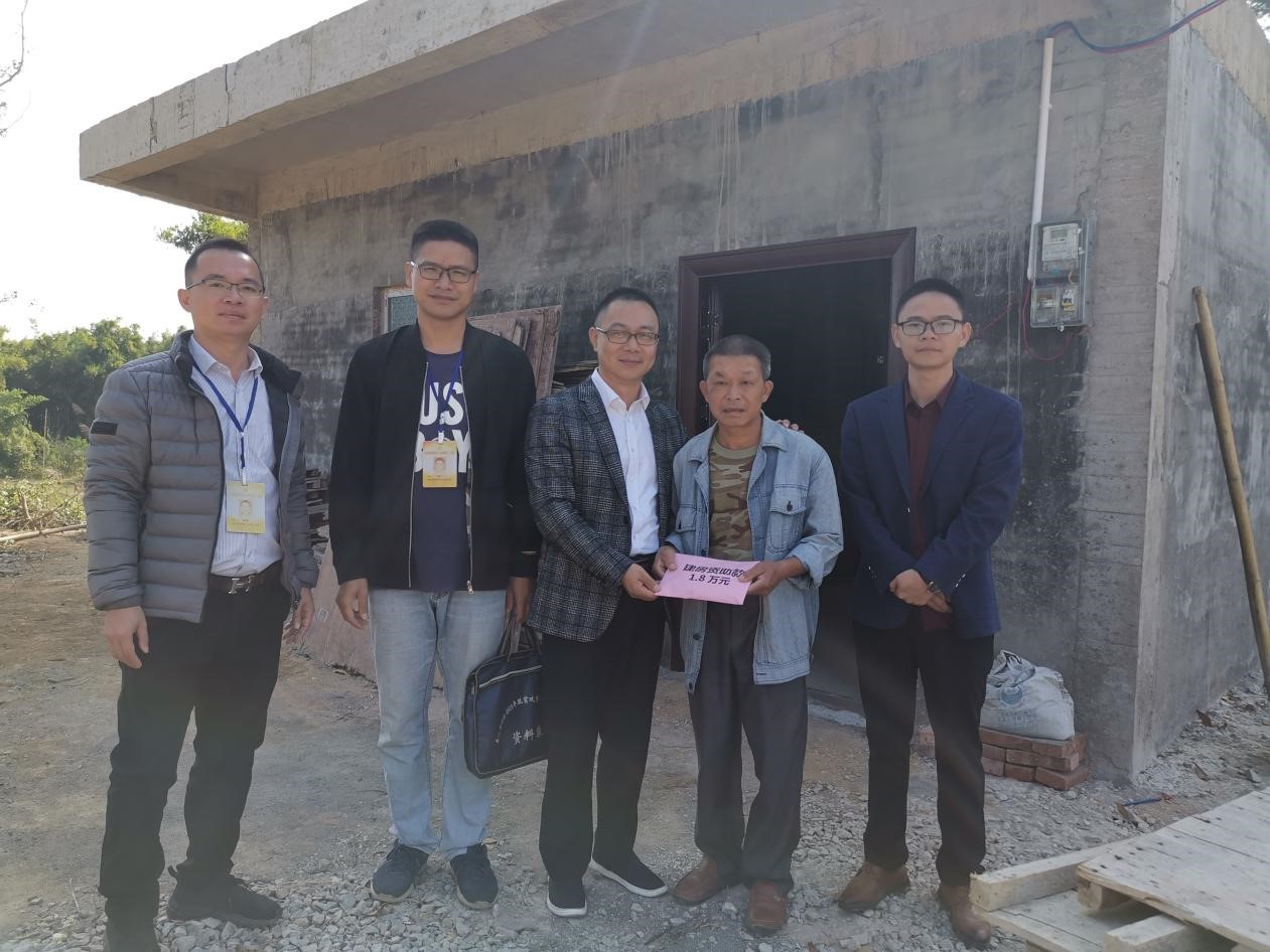 2019年11月14日上午,集團公司董事長趙文博一行在新禾村陳基茂新建的房子前,舉行了一場建房捐資活動,為貧困戶陳基茂送上了1.8萬元的建房資助款,為其新房建設(shè)解決燃眉之急,用點滴真情助力脫貧攻堅。新禾村兩委干部、駐村工作組、建房施工隊代表共同見證了建房捐資儀式。