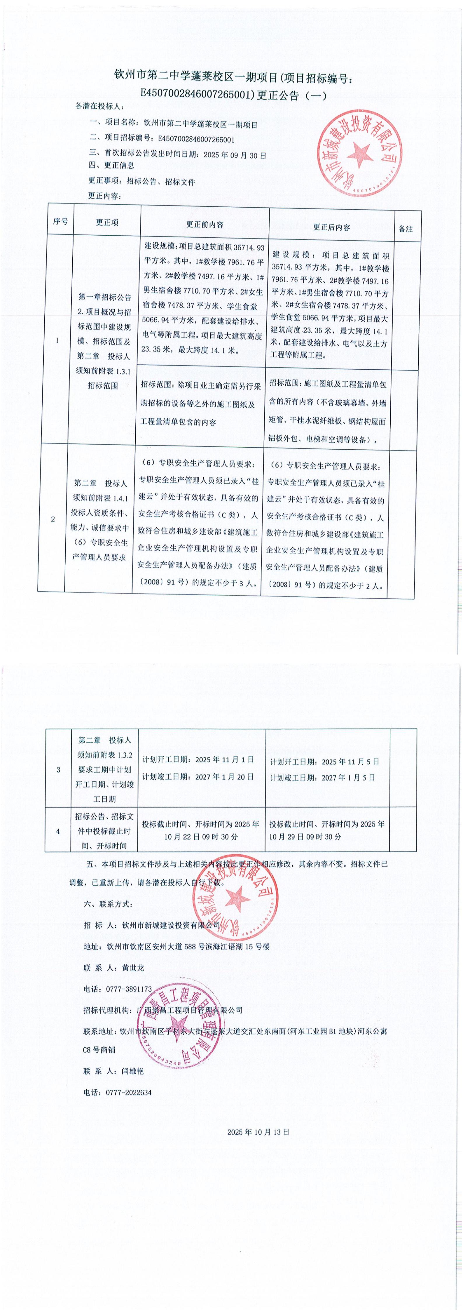 欽州市第二中學(xué)蓬萊校區(qū)一期項目監(jiān)理(項目招標(biāo)編號:E4507002846007274001)更正公告(一)