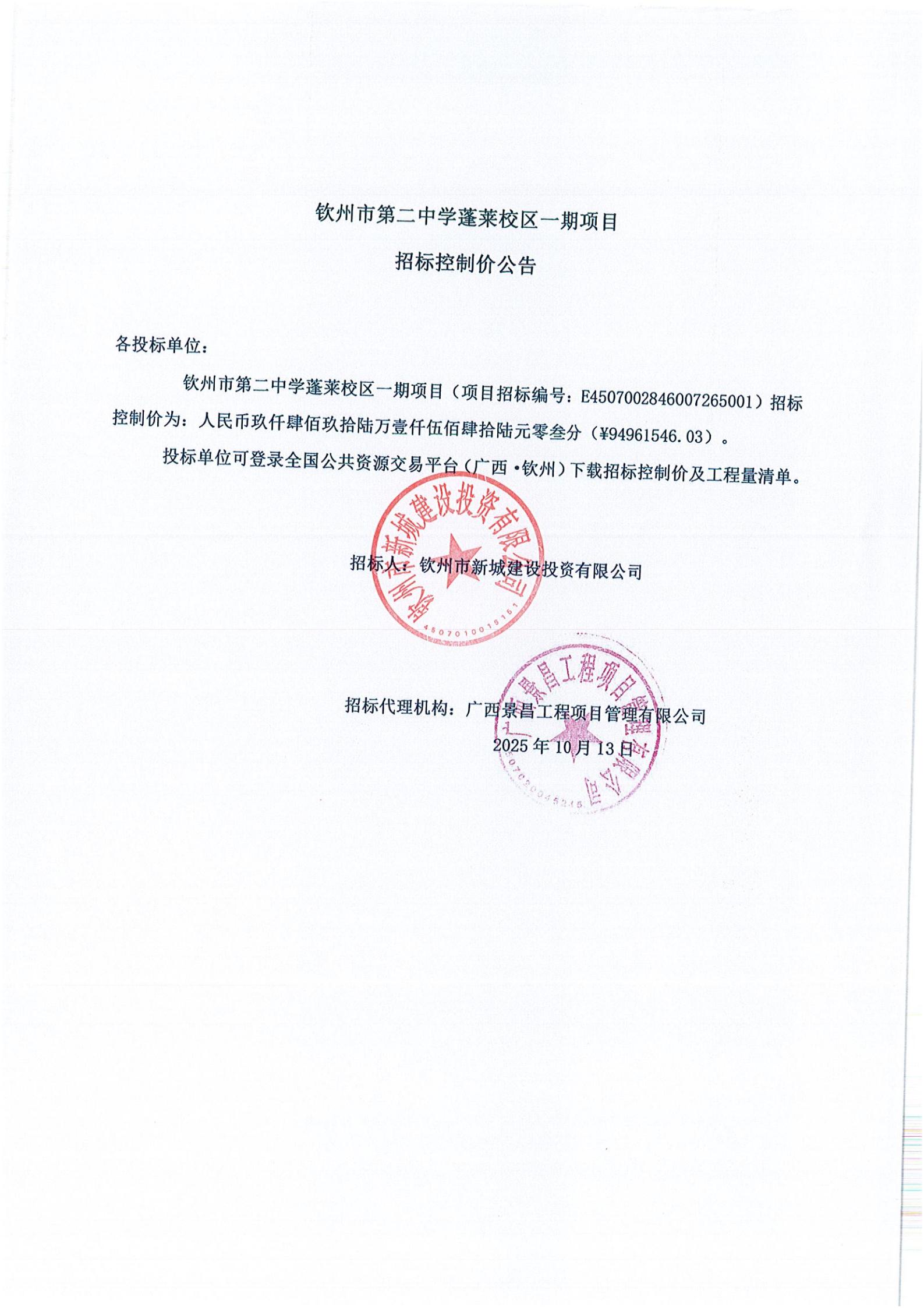 欽州市第二中學(xué)蓬萊校區(qū)一期項目招標(biāo)控制價公告