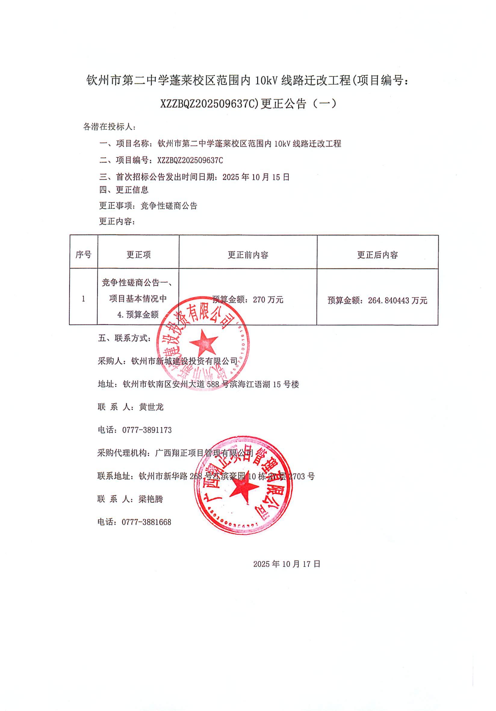 欽州市第二中學(xué)蓬萊校區(qū)范圍內(nèi)10kV線路遷改工程(項目編號: XZZBQZ202509637C)更正公告(一)