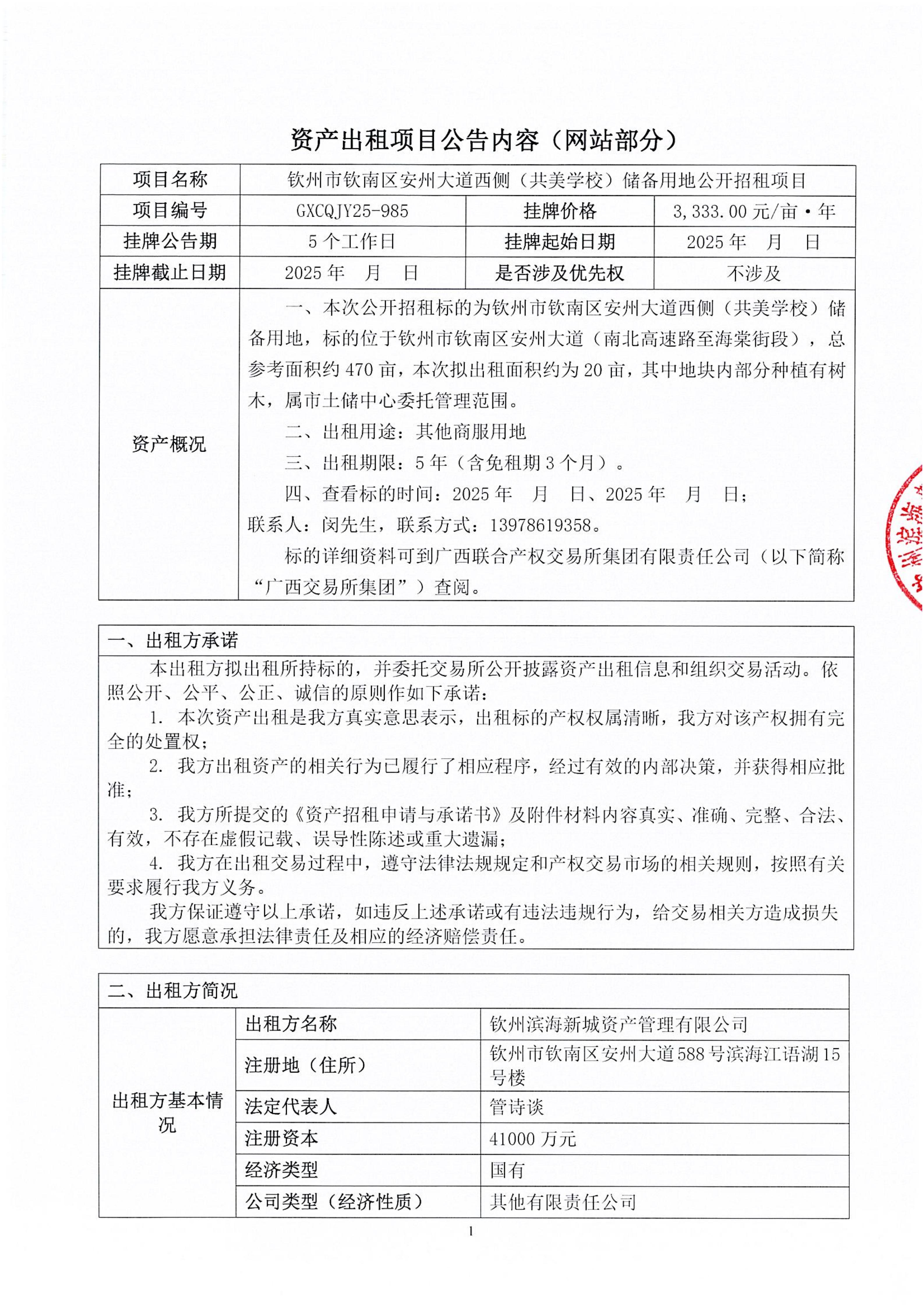 欽州市欽南區(qū)安州大道西側(cè)(共美學(xué)校)儲備用地公開招租項目