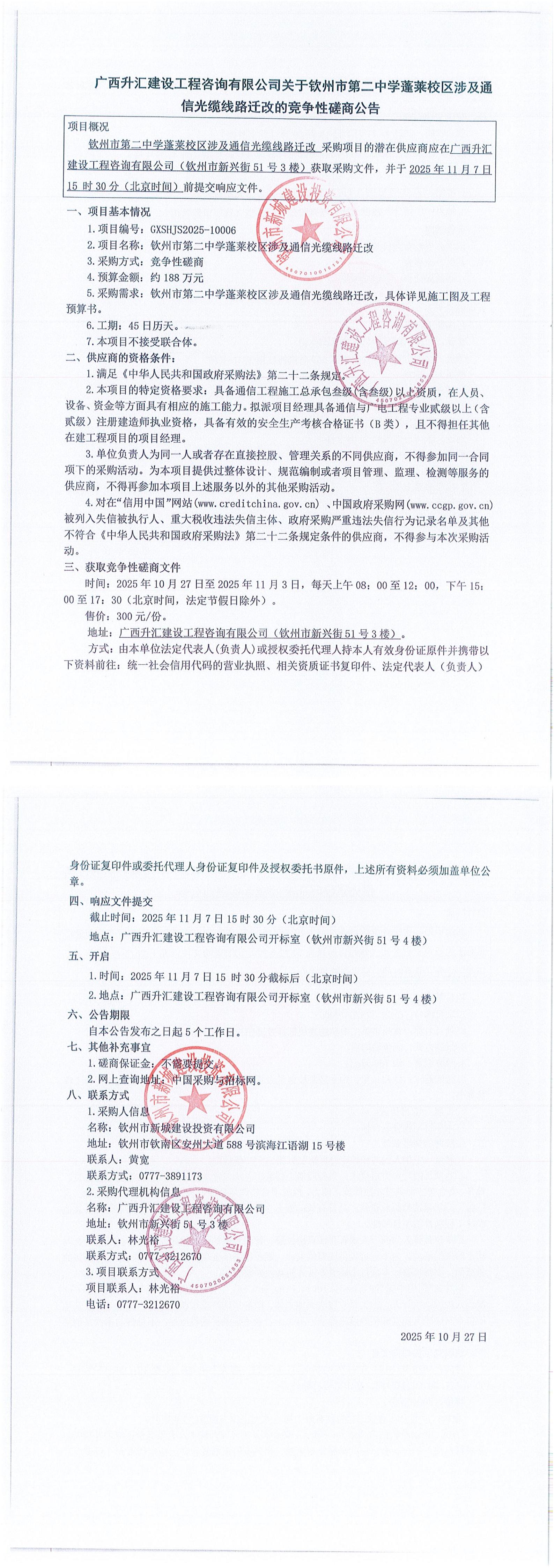 欽州市第二中學(xué)蓬萊校區(qū)涉及通信光纜線路遷改(項目編號: GXSHJS2025-10006)更正公告(二)
