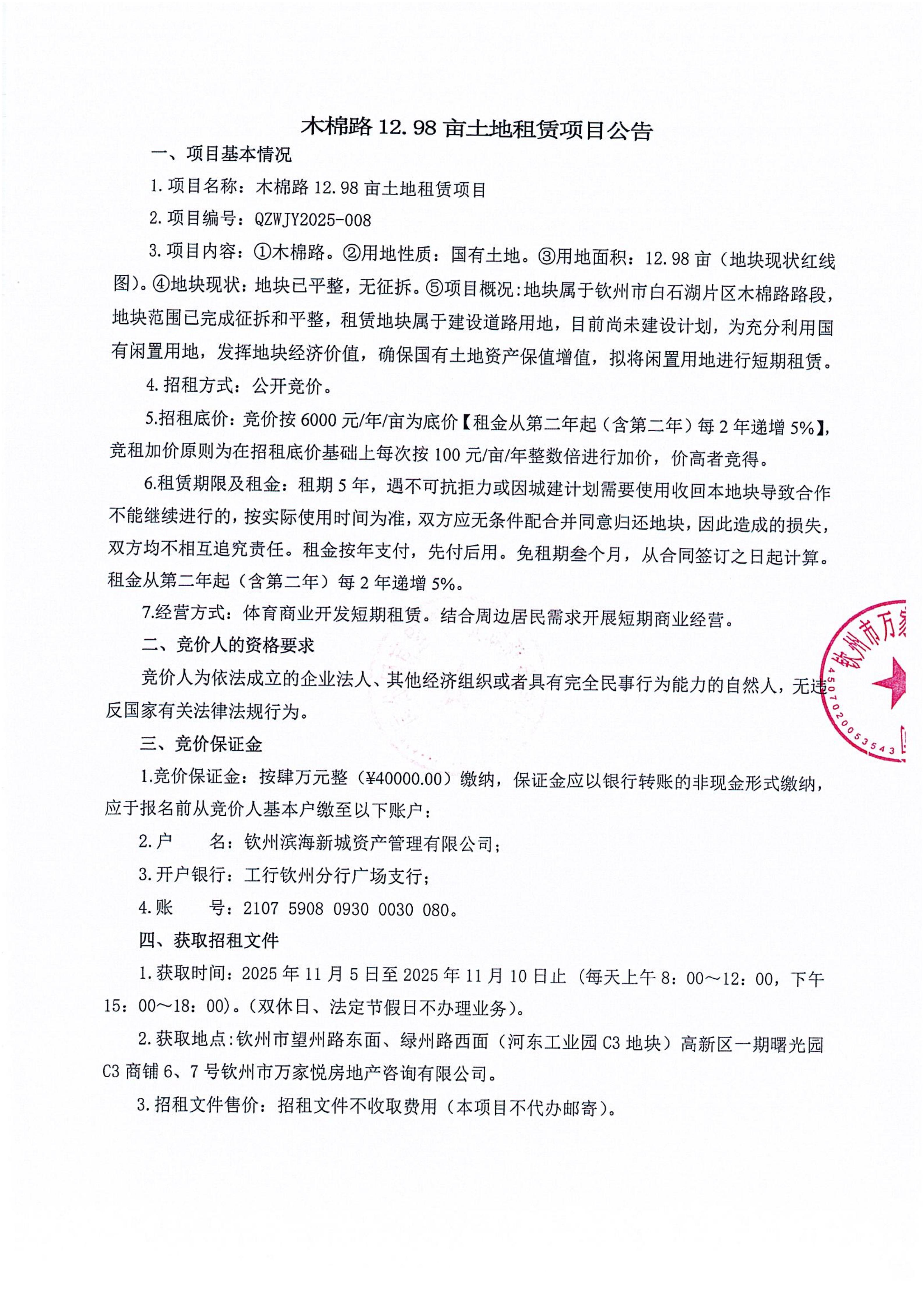 木棉路12.98畝土地租賃項目公告