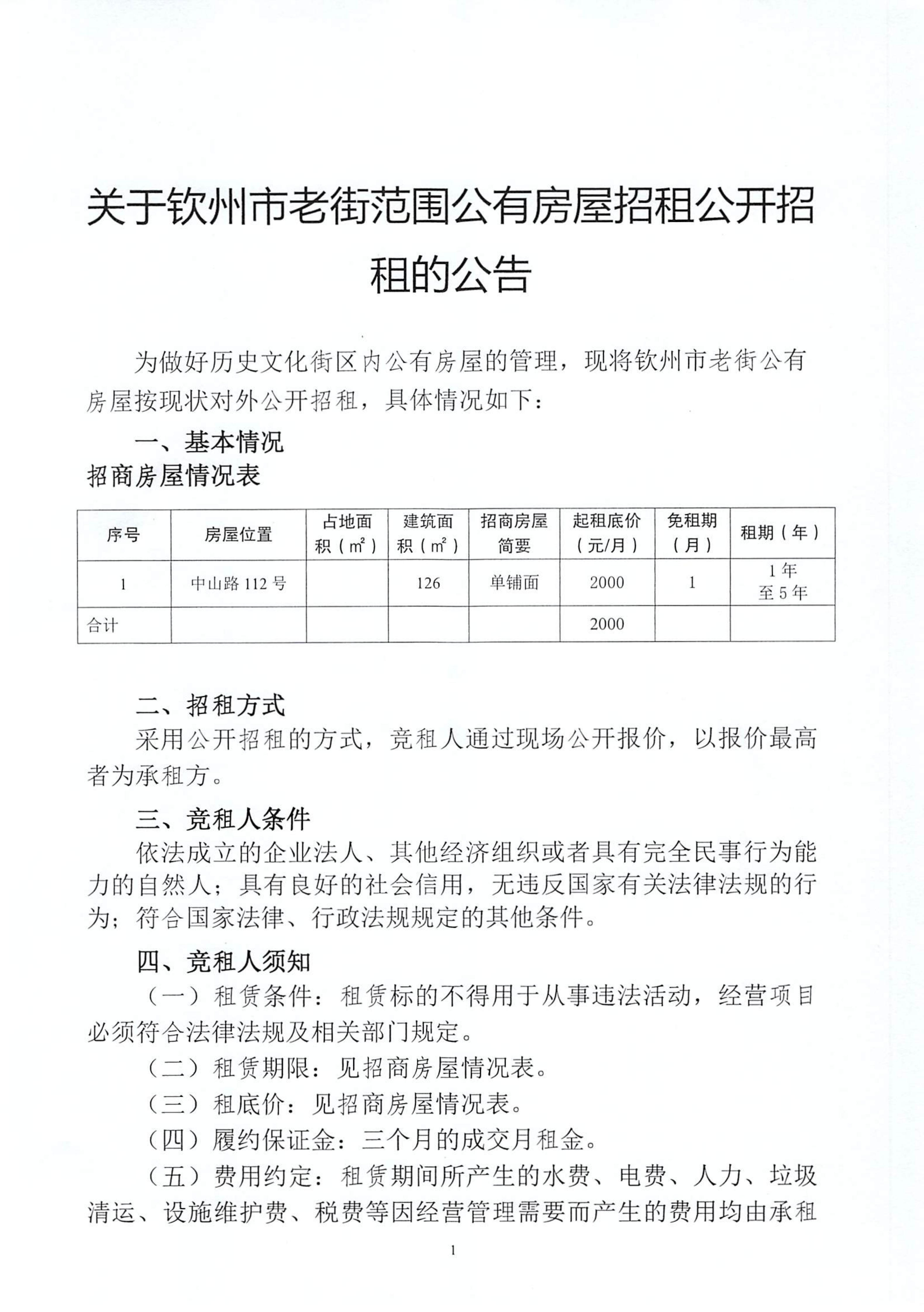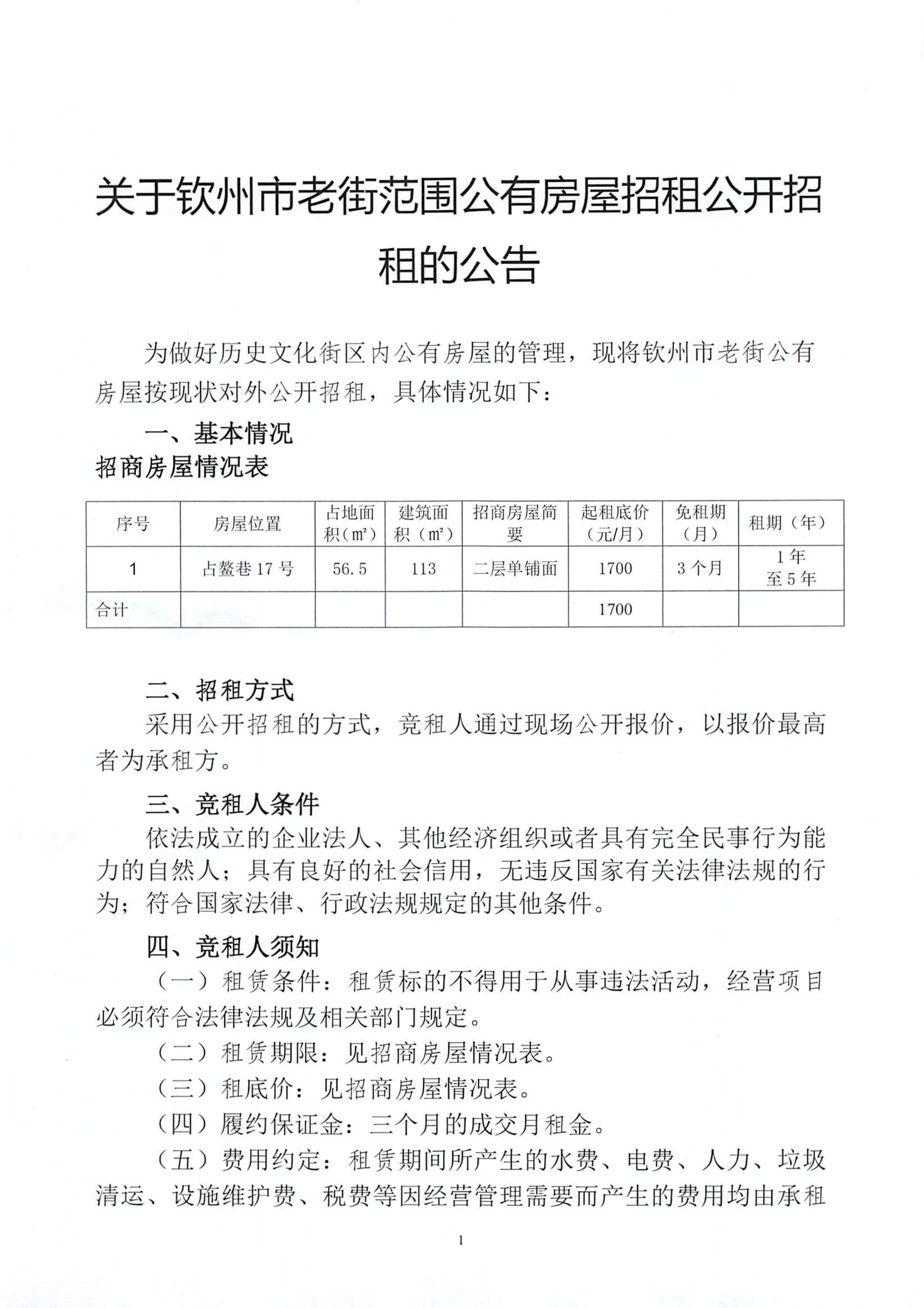 關(guān)于欽州市老街范圍公有房屋招租公開招租的公告